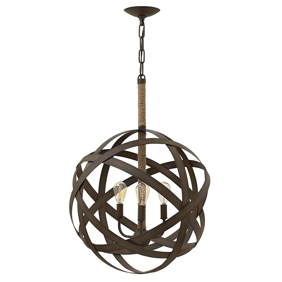Carson pairs a hint of industrial sophistication and repurposed craftsmanship with its bold overlapping metal ribbons. The hand-crafted pendants in an Iron Rust finish are suspended from an aged rope column for a subtle touch of reclaimed charm.