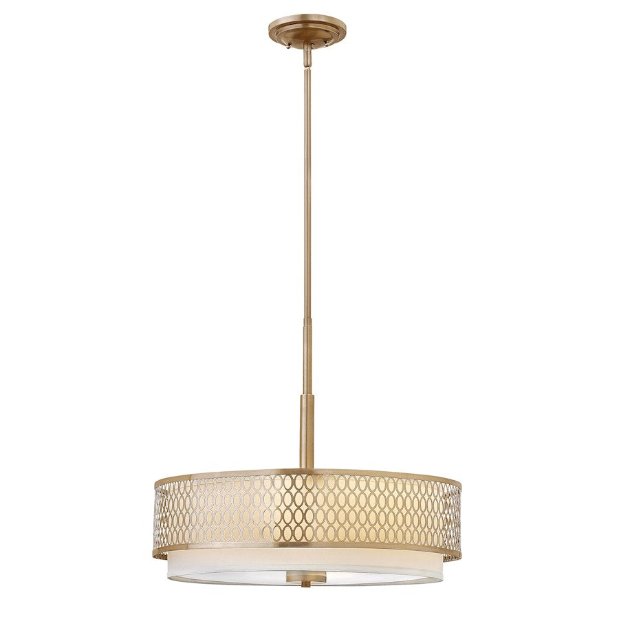 Jules features a repeating stamped oval design in a luxe Brushed Gold or Brushed Nickel finish. This striking pattern play creates a statement-making transitional silhouette.Made of Steel Shade: White Linen Glass: Etched Lens (3) 100W MED Bulb(s) Bulb(s) Not Included Voltage: 120 Volts Install Position: Up Install Sloped Ceiling: Yes Slope Degree: 90 Included Down Rods: 1-6", 1-12", 1-18" Wire Length: 120" Style: Contemporary Cool, Refined Transitional Safety Rating: C-US Dry Rated