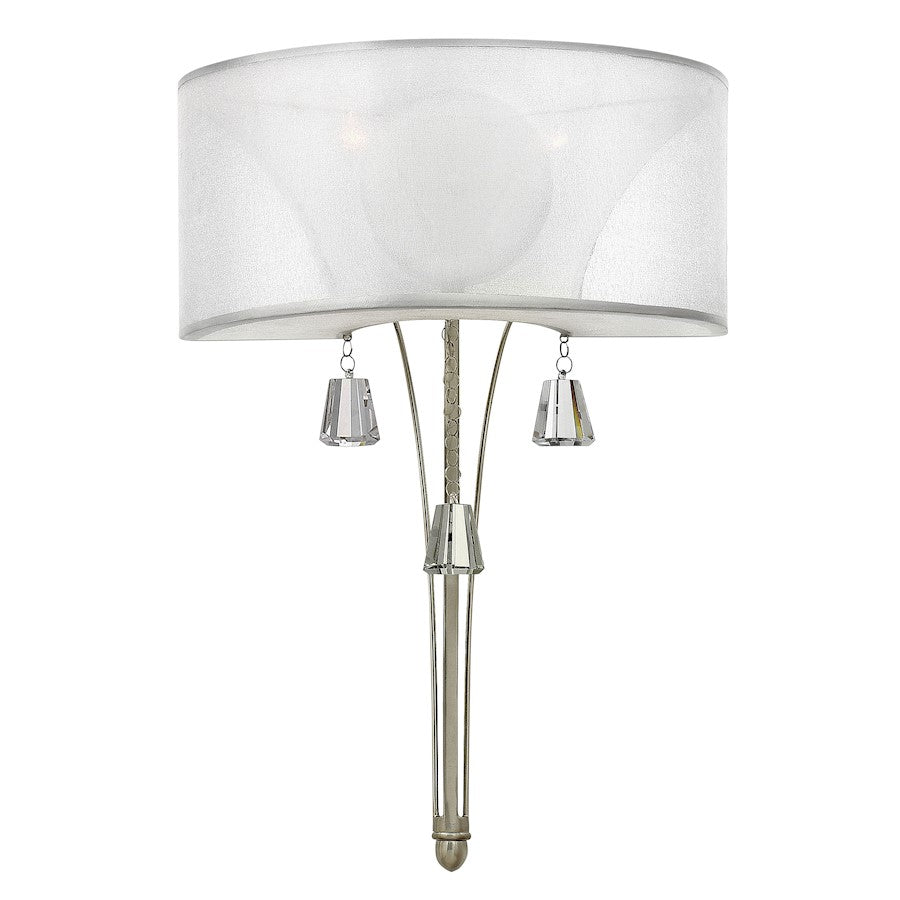 This elegant collection in our Brushed Nickel and French Bronze finish features a sheer translucent double hardback shade and tapered square crystal accents.