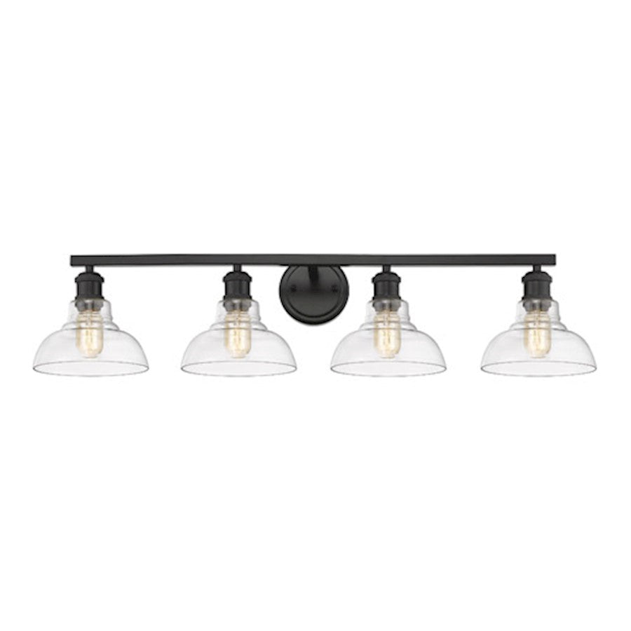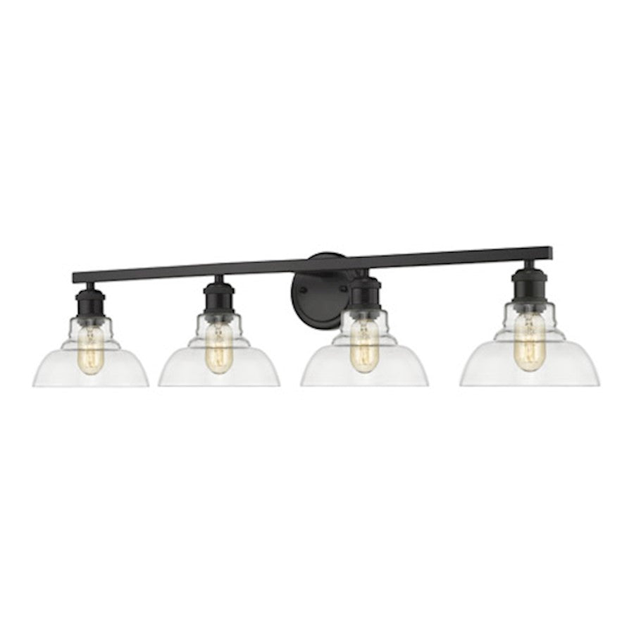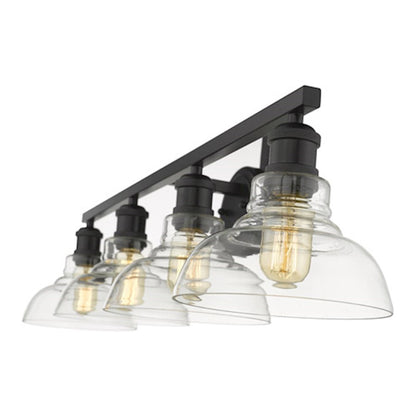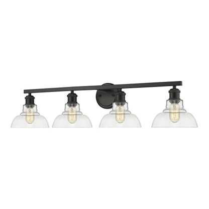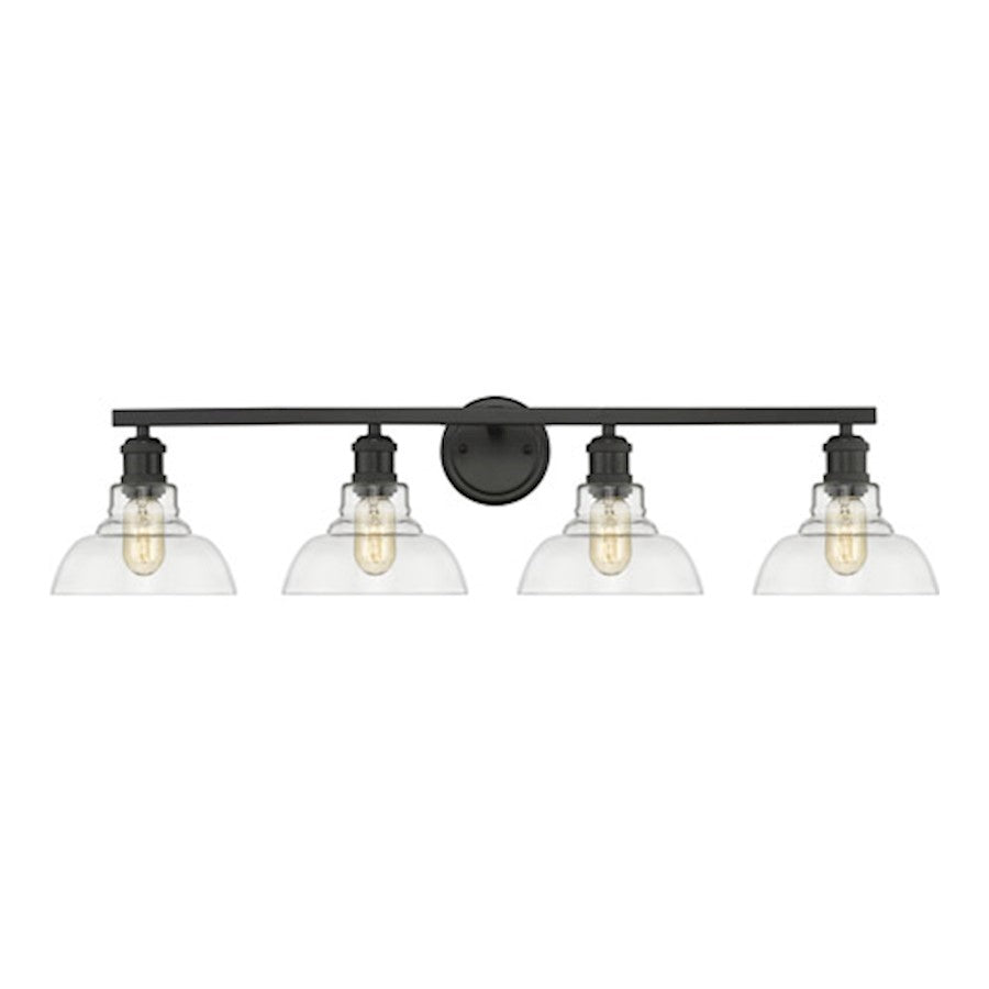 This four-light bath vanity has a cool, industrial design that will be the finishing touch in any bathroom especially those with modern and transitional styles. Available in two finishes, the smooth black finish will add a sleek look to a bathroom with clear glass shades. This fixture is safely rated for all damp locations, and is easy for anyone to install since all mounting hardware is included. This fixture will bring out all refined details in a bathroom because the durable and elegant construction of this bath light is fashioned with beautiful details itself.