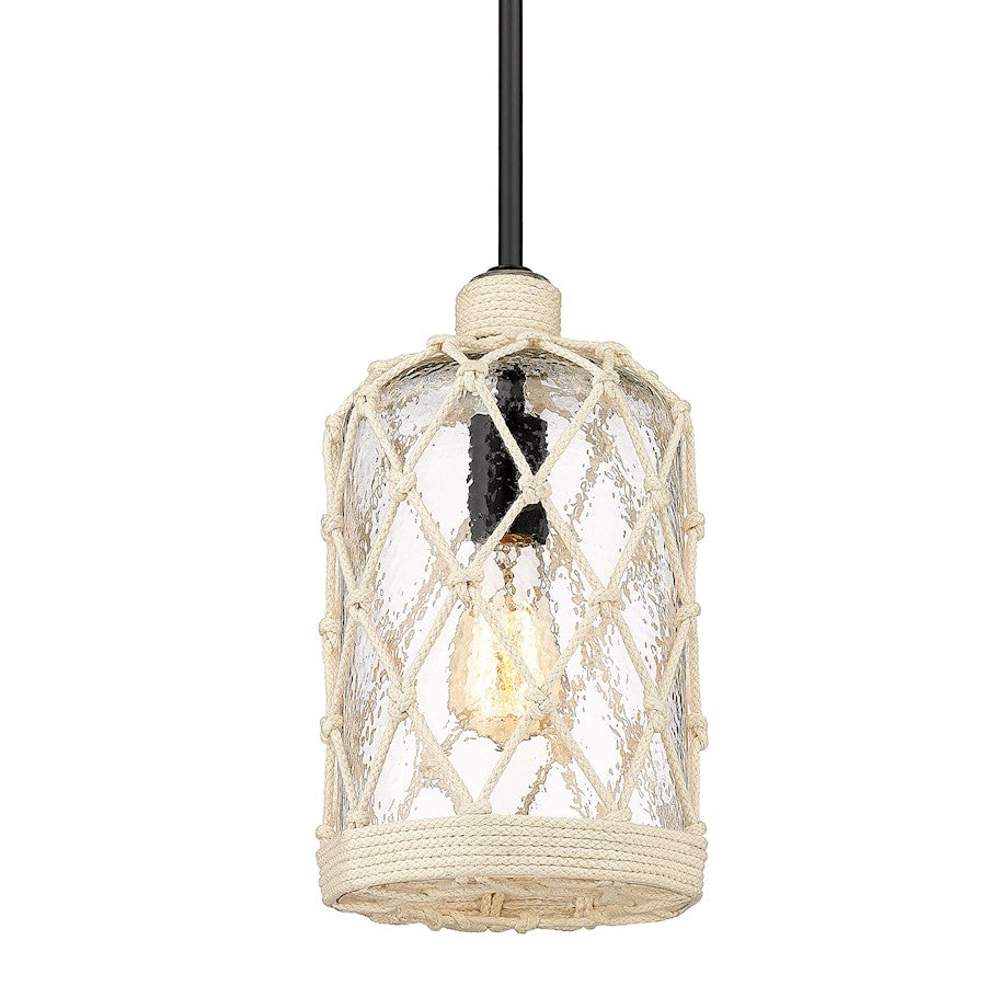 Enhance your coastal space with Nassau. Authentic fishnet knots in a clean white rope wrap the hammered clear glass shade. The rope finishes just before the glass bottom, resting atop one another. The hammered glass shade's open bottom has a clean look. The larger light within this collection offers an optional fringe tassel.