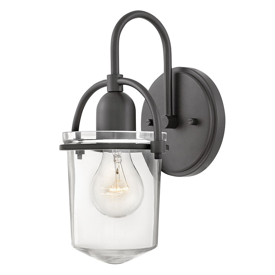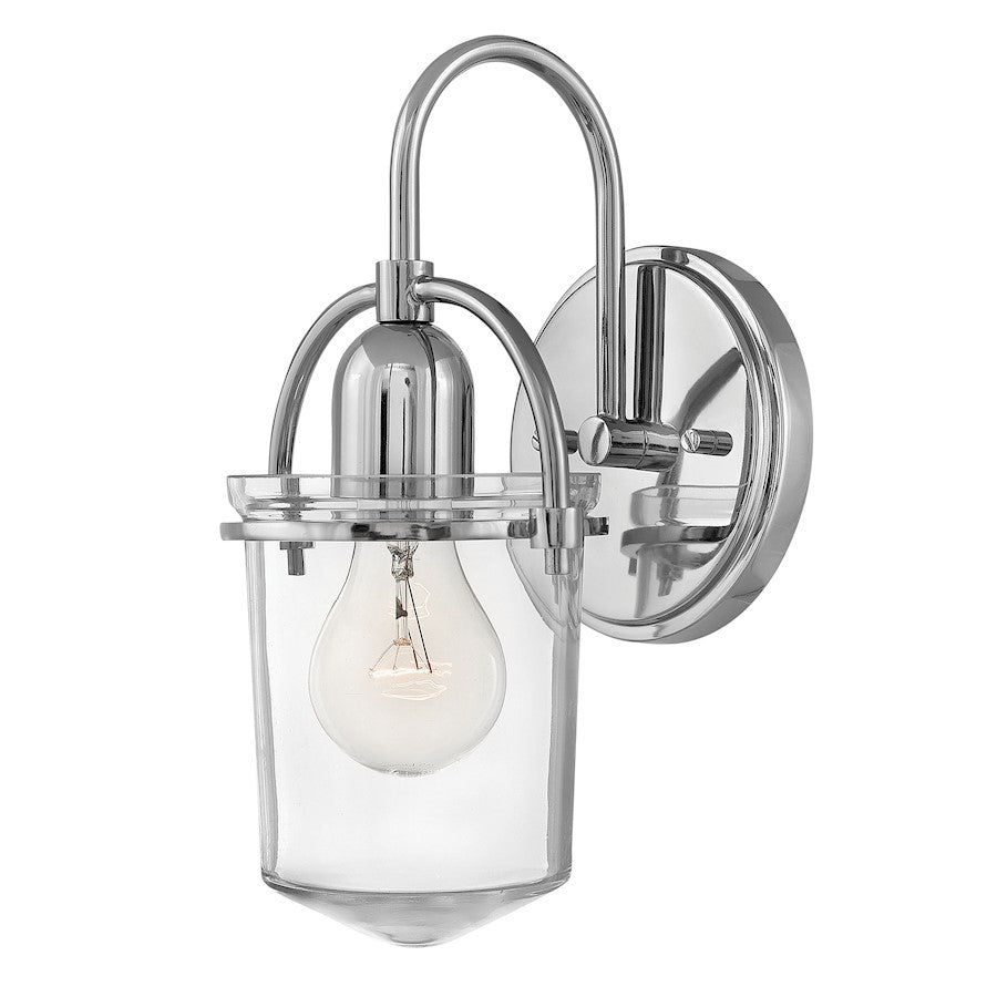 Clancy's transitional design features a clear glass urn, retro decorative construction elements and soft curves for an elegant style with vintage overtones.