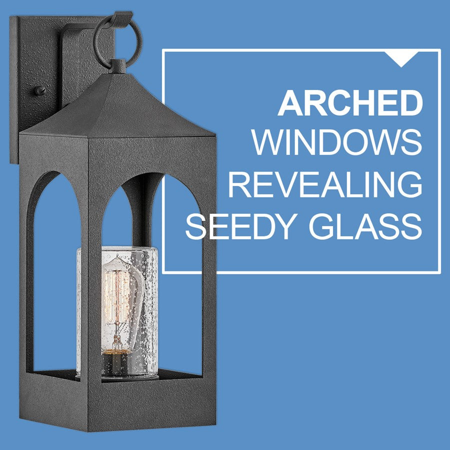 Amina is tradition with a flair. Part of the Heritage collection, this lantern-inspired wall mount features dramatic, arched windows revealing a seedy glass that creates a faux candle effect. Constructed of durable aluminum in a Distressed Zinc finish, Amina is complete with an oversized loop reinforcing its timeless appeal. Vintage setting filaments recommended.