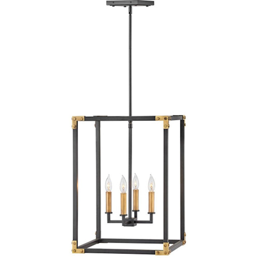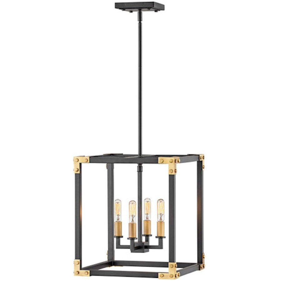 Transport your decor to a stylish new dimension. Inspired by vintage trunks, cast campaign corners with oversized rivets are the hallmark of Louis. A Satin Black frame, accented at each corner with Heritage Brass coordinates with the candelabra within.Height (Min-Max): -48.75 Height (Min-Max): -56.75