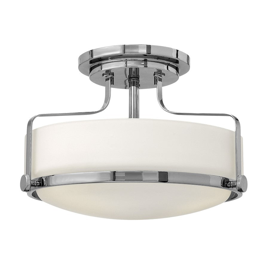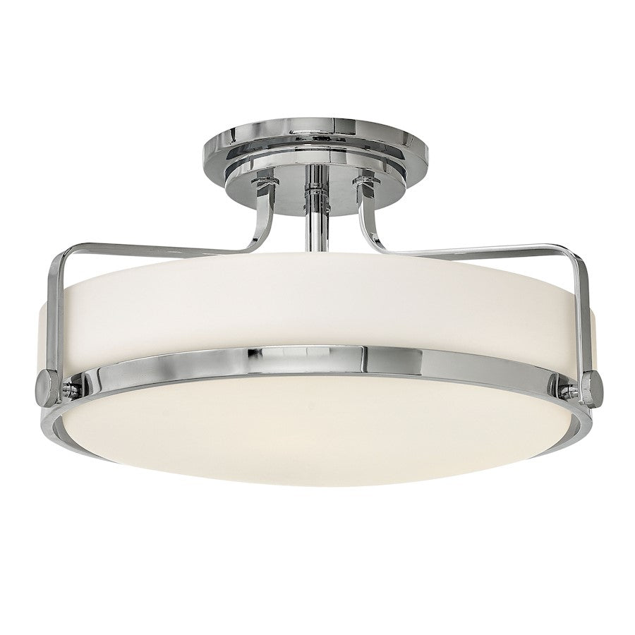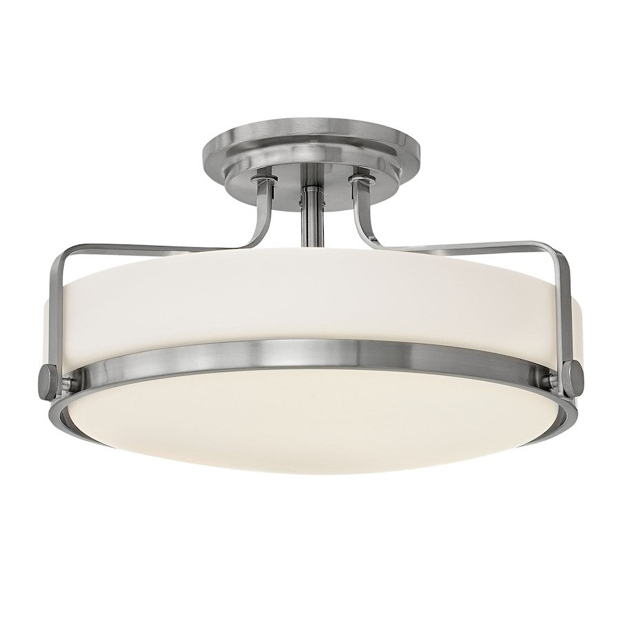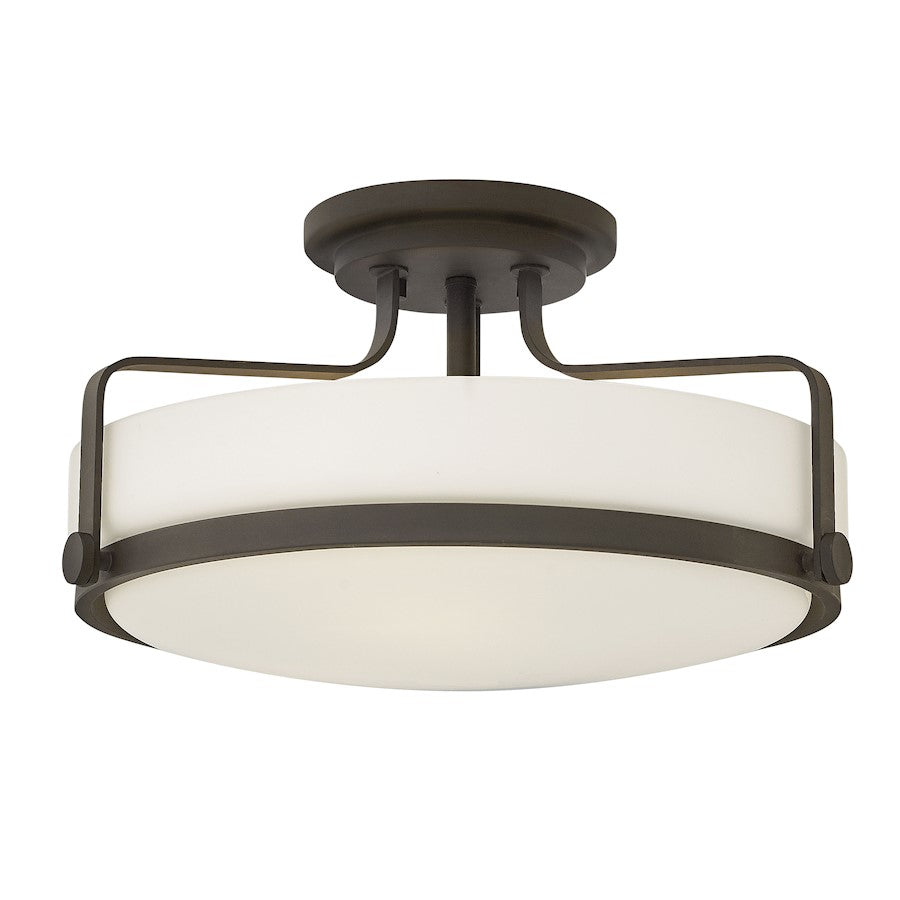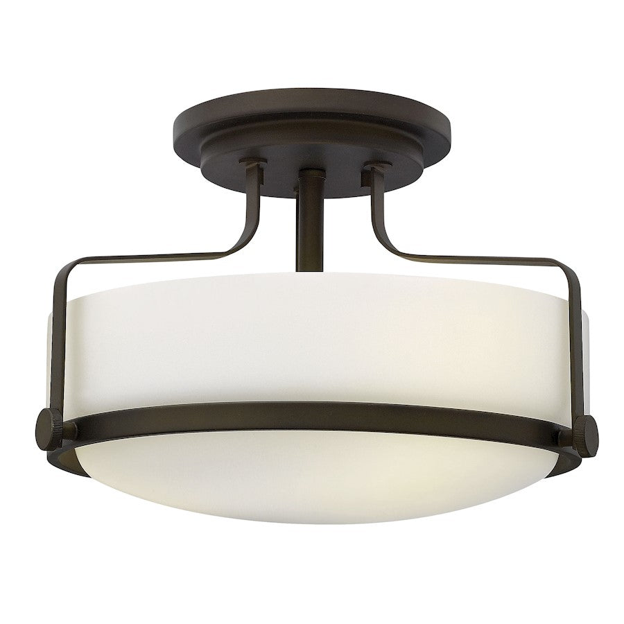 Harpers sleek, retro design elevates the traditional flush mount with a unique opal glass bound by a prominent metal ring and decorative knobs available in three finishes.