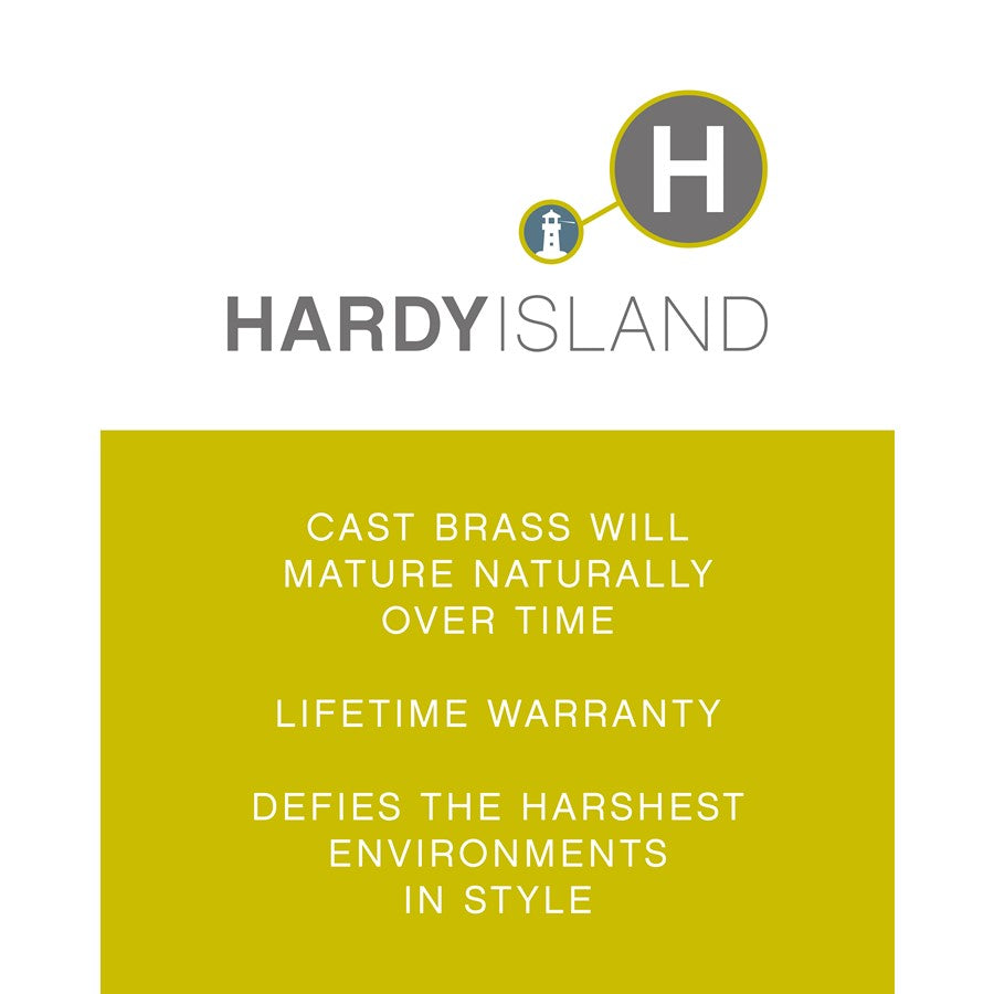 - The Hardy Island Collection, named for the ruggedly beautiful island off the coast of British Columbia, defies the harshest environments in style with landscape lighting that features fully enclosed lamps and a rich weathered brass finish that will mature naturally over time.