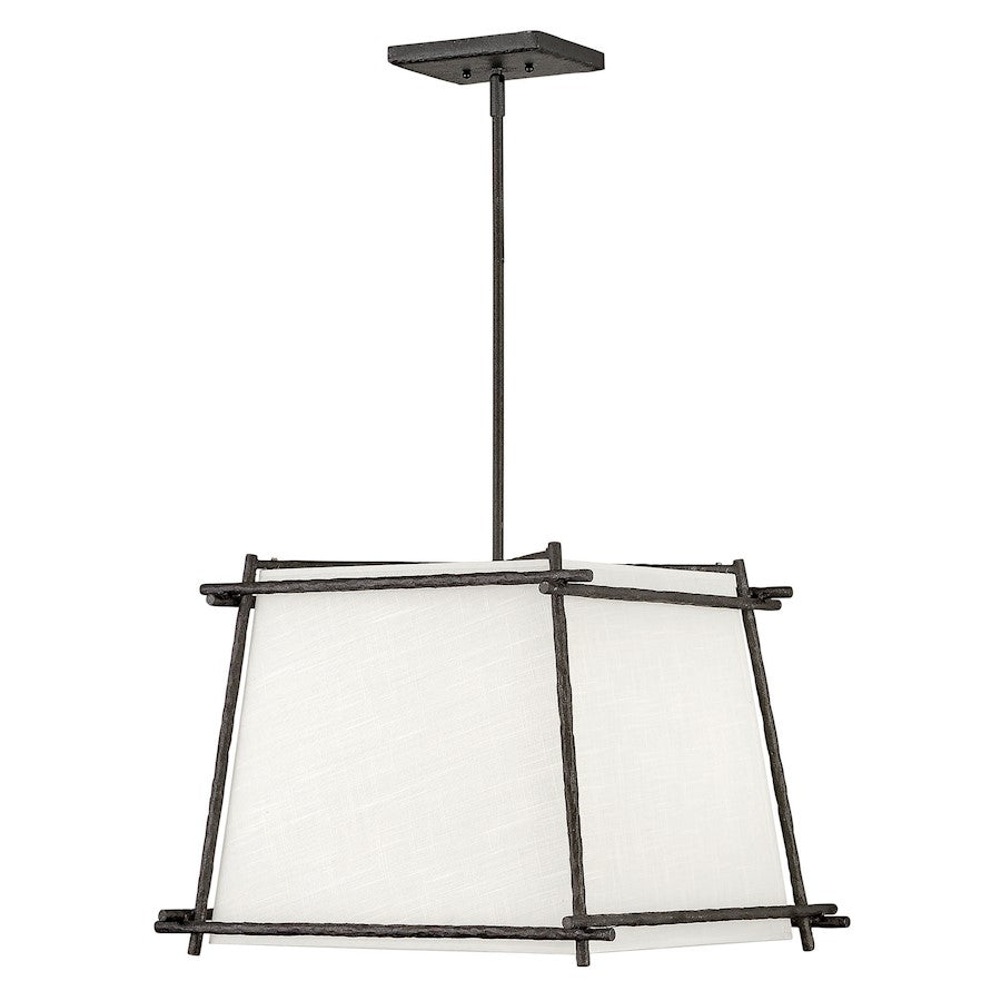 Tress approaches style from a different angle. The off-white textured fabric shade is bias-cut and framed in overlapping, hammered metal rods of Champagne Gold or Forged Iron. This simple structure translates into a sophisticated trapezoidal prism. Tress uses this natural look to add an organic feel to transitional decor.Height (Min-Max): -44.75 Height (Min-Max): -49