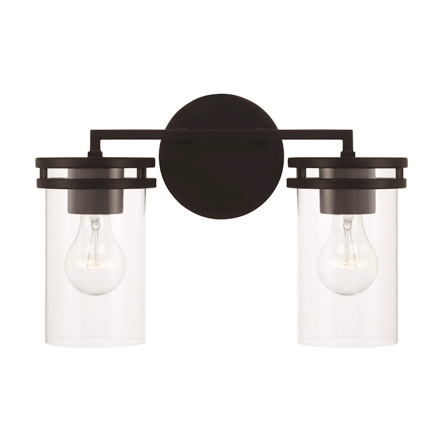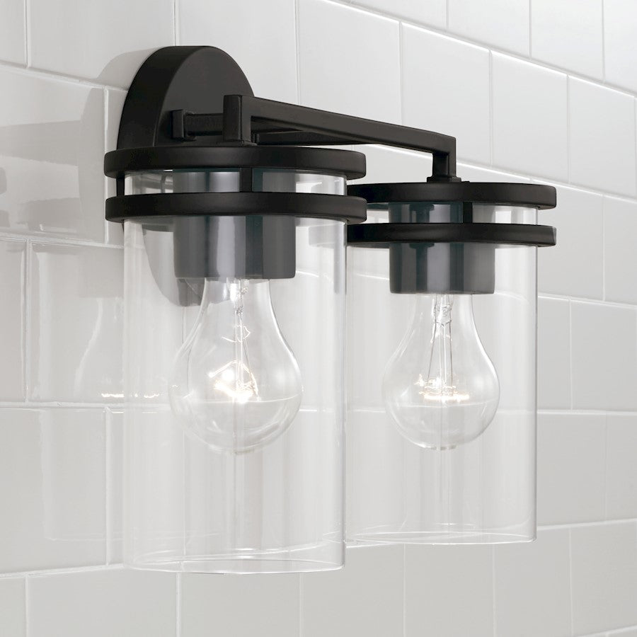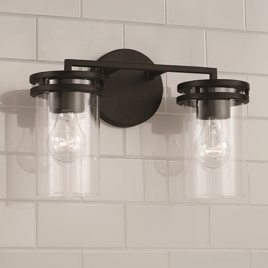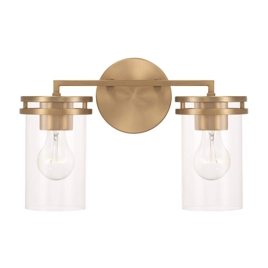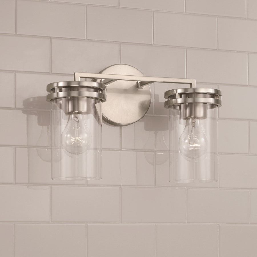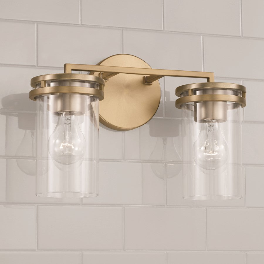 The contemporary form and clear glass create sleek style with the Fuller 2-Light Vanity for HomePlace. The Matte Black or Aged Brass or Brushed Nickel finish brings modern sophistication to any space. Also available in a 3-Light or 4-Light.