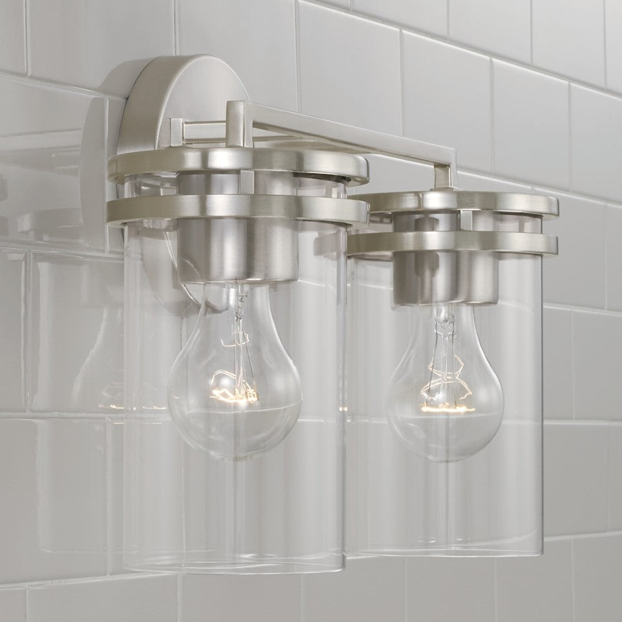 - DETAILS: Clear glass cylinders in 2-Light, 3-Light, or 4-Light available in three finishes of Aged Brass, Brushed Nickel, or Matte Black for style versatility.