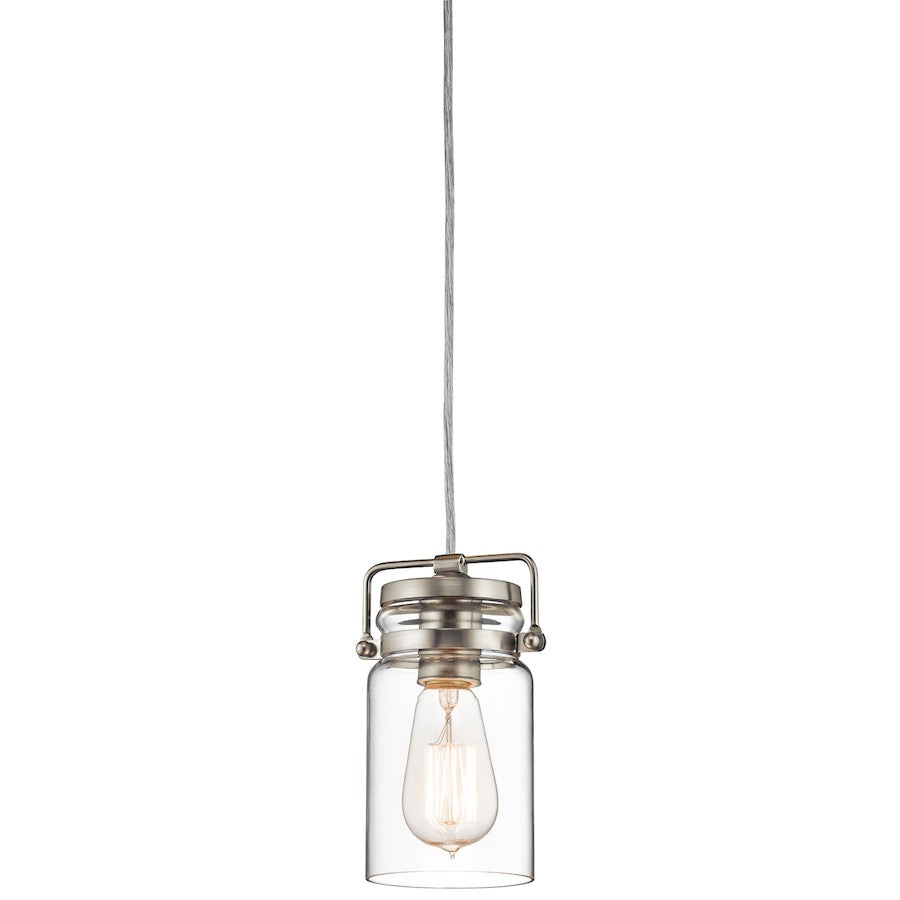 The vintage style of this 1 light mini pendant from the Brinley collection gives a beautifully modern treatment to the familiarity and comfort of canning jars. Used in groups or stand-alone, the Brinley collection is a new touch of home in Brushed Nickel or Olde Bronze.