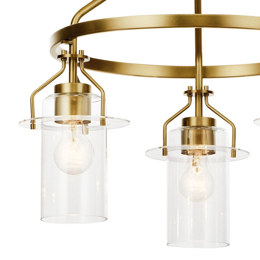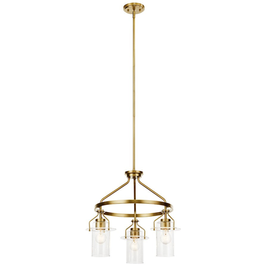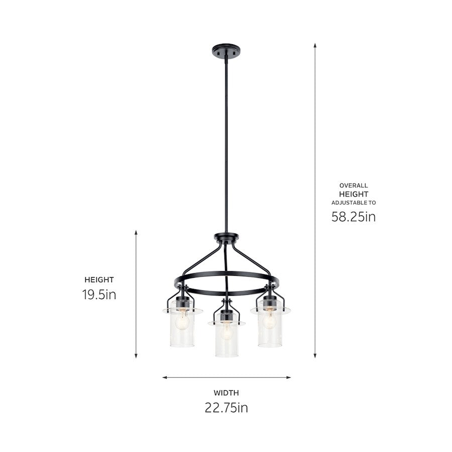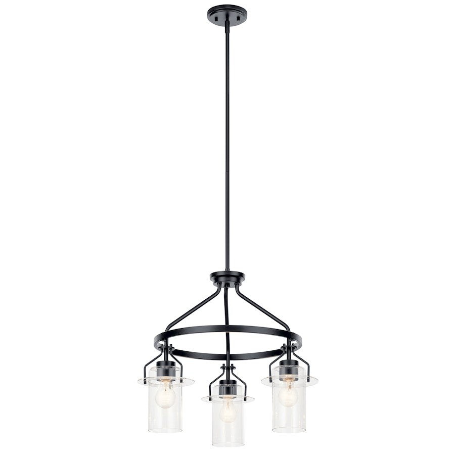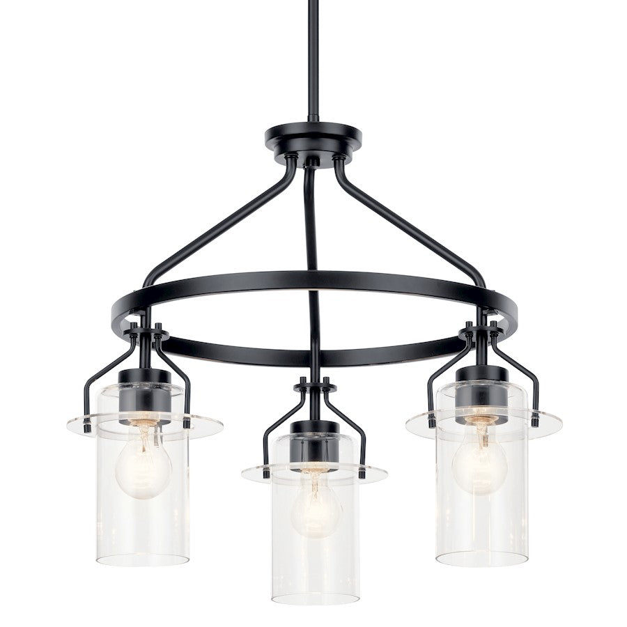 The Everett 22.5 inch 3 light chandelier adds a dash of industrial glam to your space. Three mini Clear Glass pendants are suspended from an open metal circle finished in Black or Polished Nickel. A delicate clear acrylic disc appears to hold each pendant and your attention.