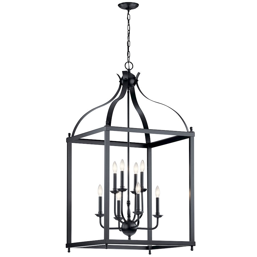 This 8 light large foyer pendant cage from the Larkin? collection creates a strong, linear silhouette. The Black finish and steel form of this design will effortlessly accent your home.