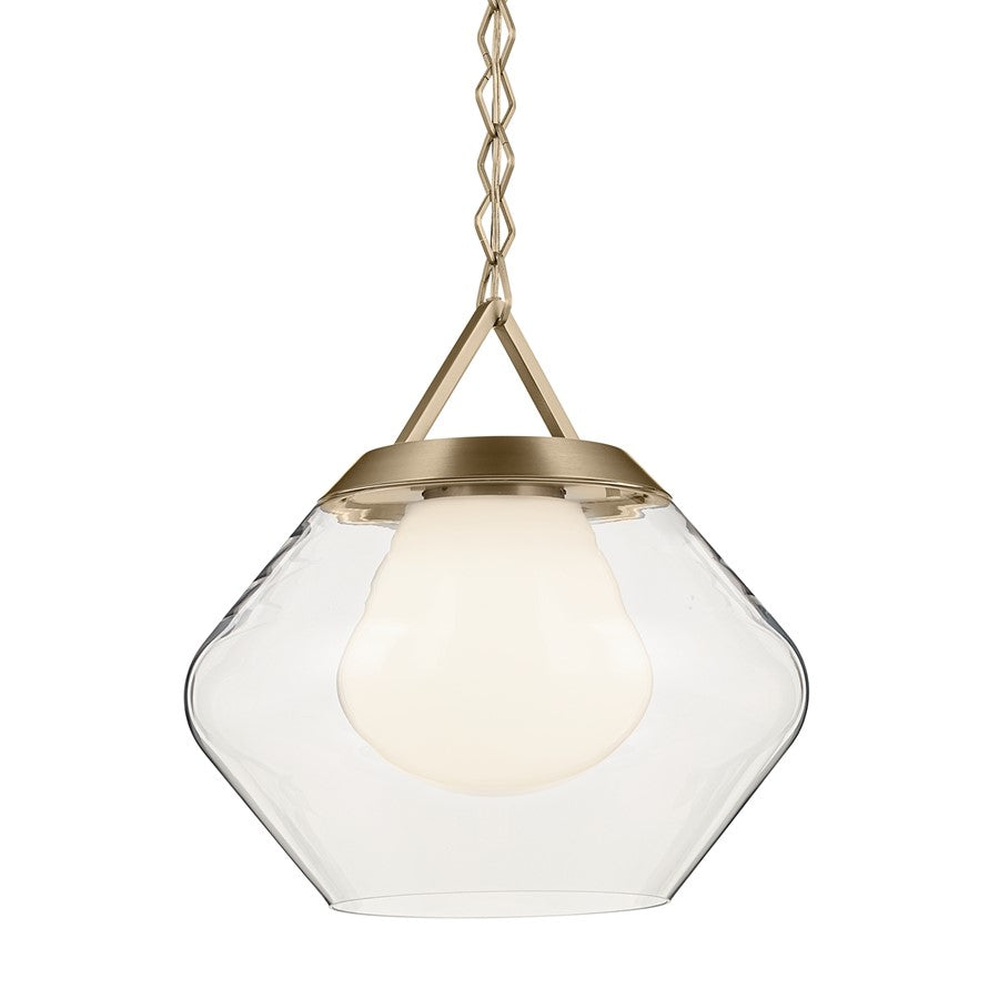 The Nella pendant captivates through its geometric shapes. The chain features diamond-shaped links, gracefully cascading down from the ceiling to reveal light encased in layered glass. This evolution of the popular globe shape has two glass layers. The outer later is clear glass, and the inner layer is cased opal glass. It comes together for a pendant unlike any other.
