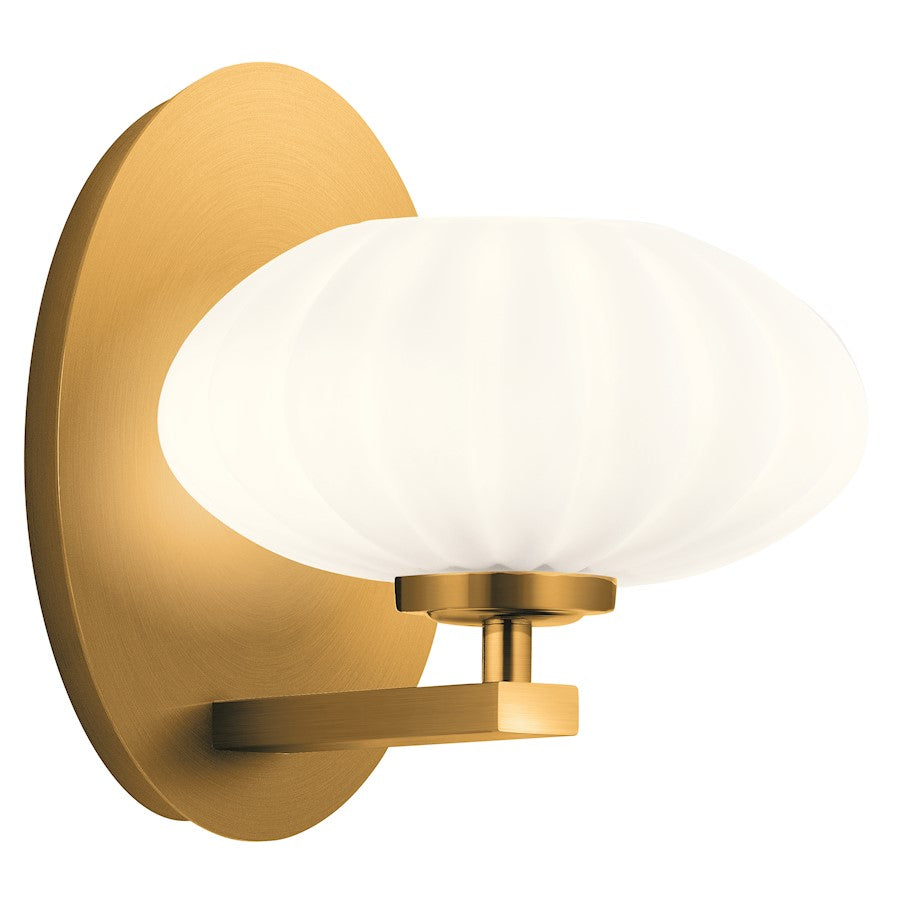 The Pim 8in. 1 light wall sconce features a nostalgic mid century modern design in Fox Gold or Polished Nickel and rounded shaped satin etched cased opal glass. A perfect addition in several aesthetic environments including contemporary and transitional.Height From Center of Wall Opening: 4