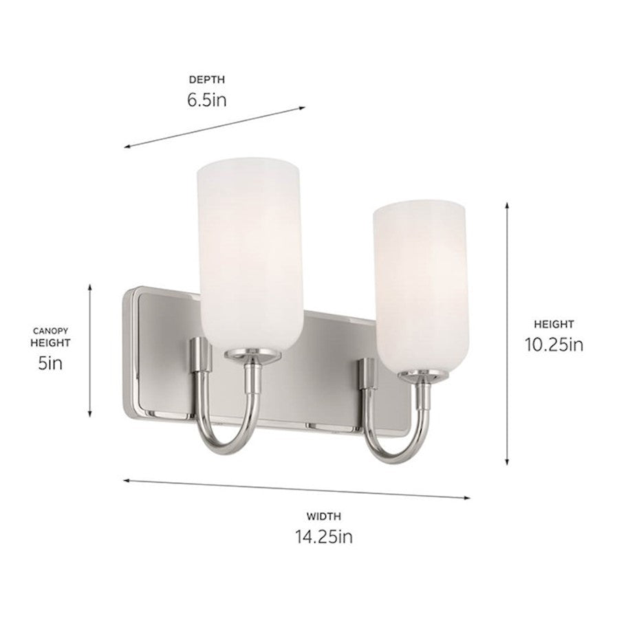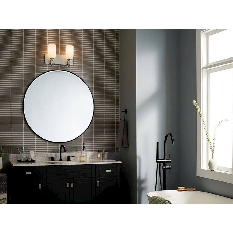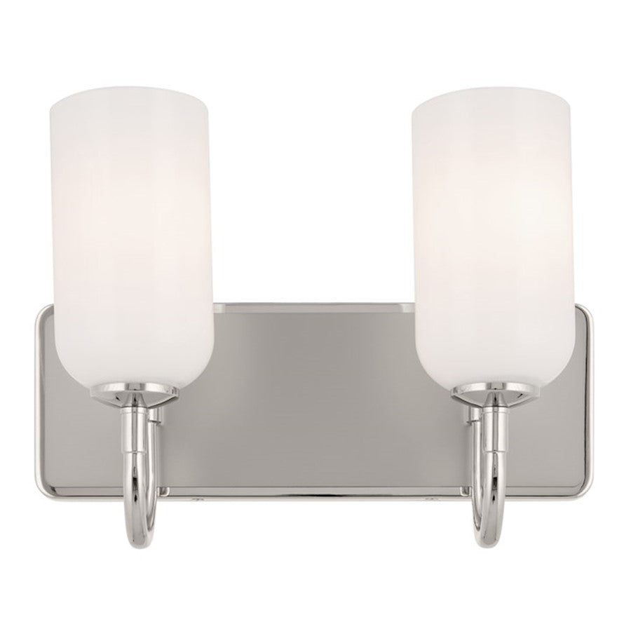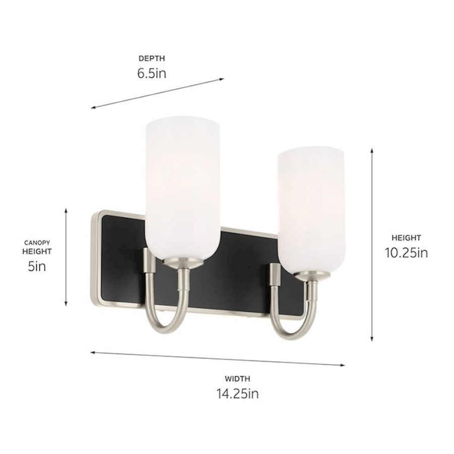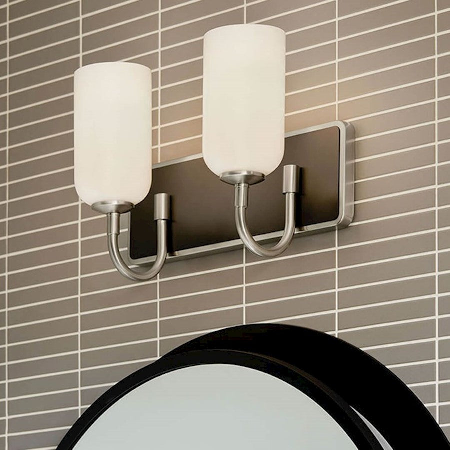 Inspired by simplicity, the Solia 2 light vanity exudes soft modern style. It's dual-finished brushed nickel and black backplate or brushed nickel and black backplate or polished nickel and satin nickel backplate adds visual interest. Solia's refined opal glass illuminates in modern sophistication.Height From Center of Wall Opening: 6.25