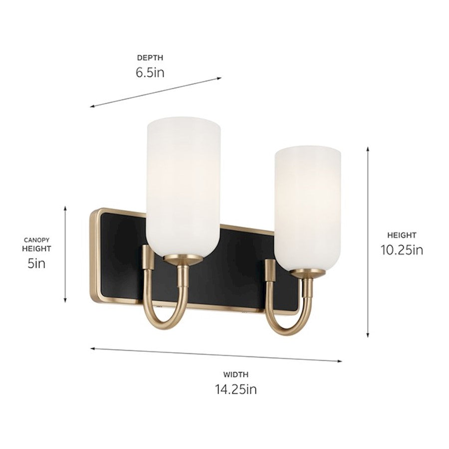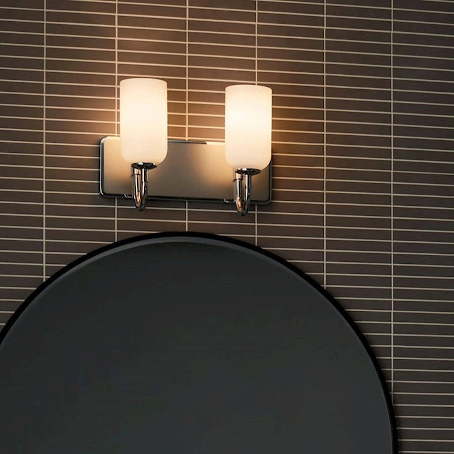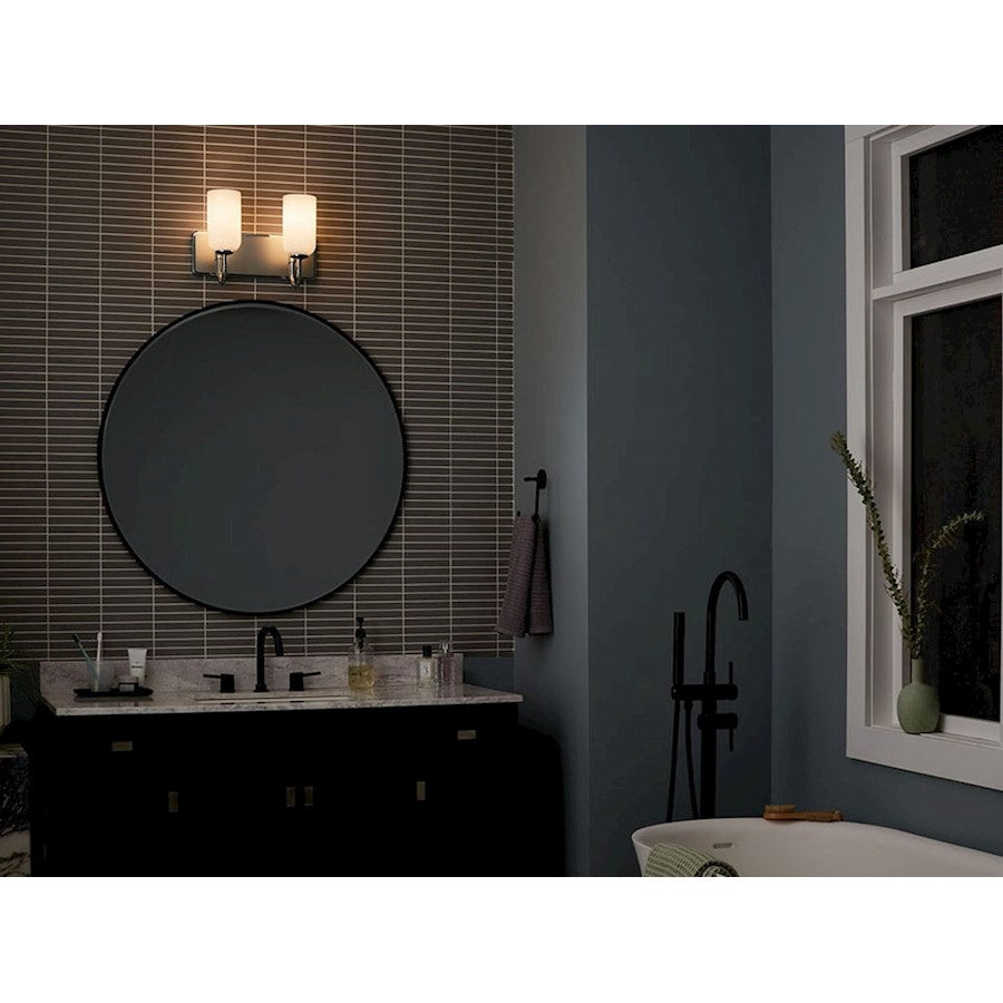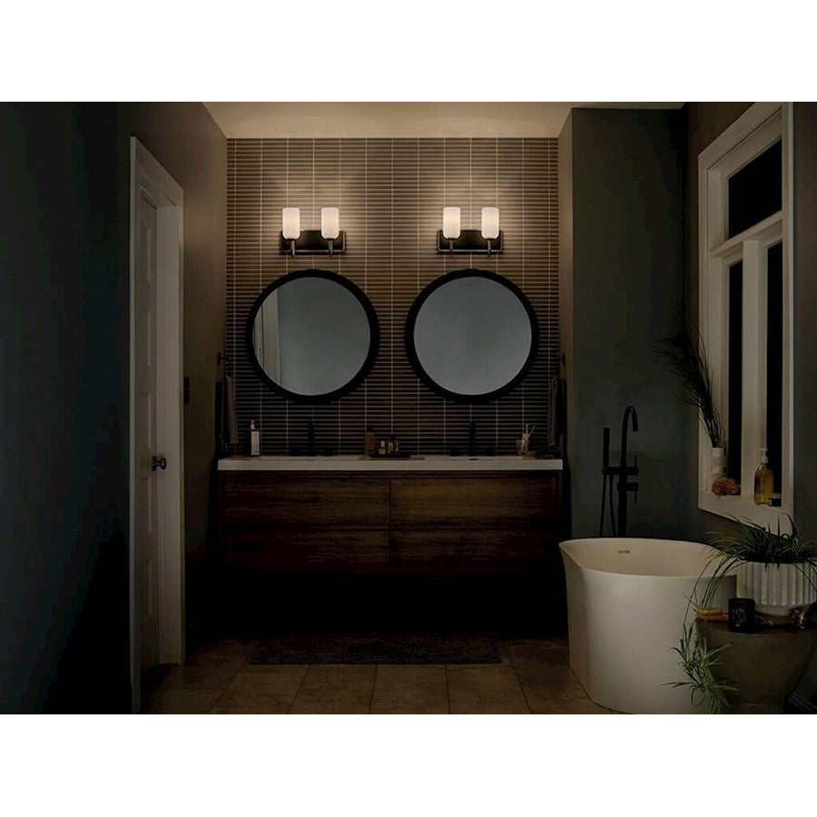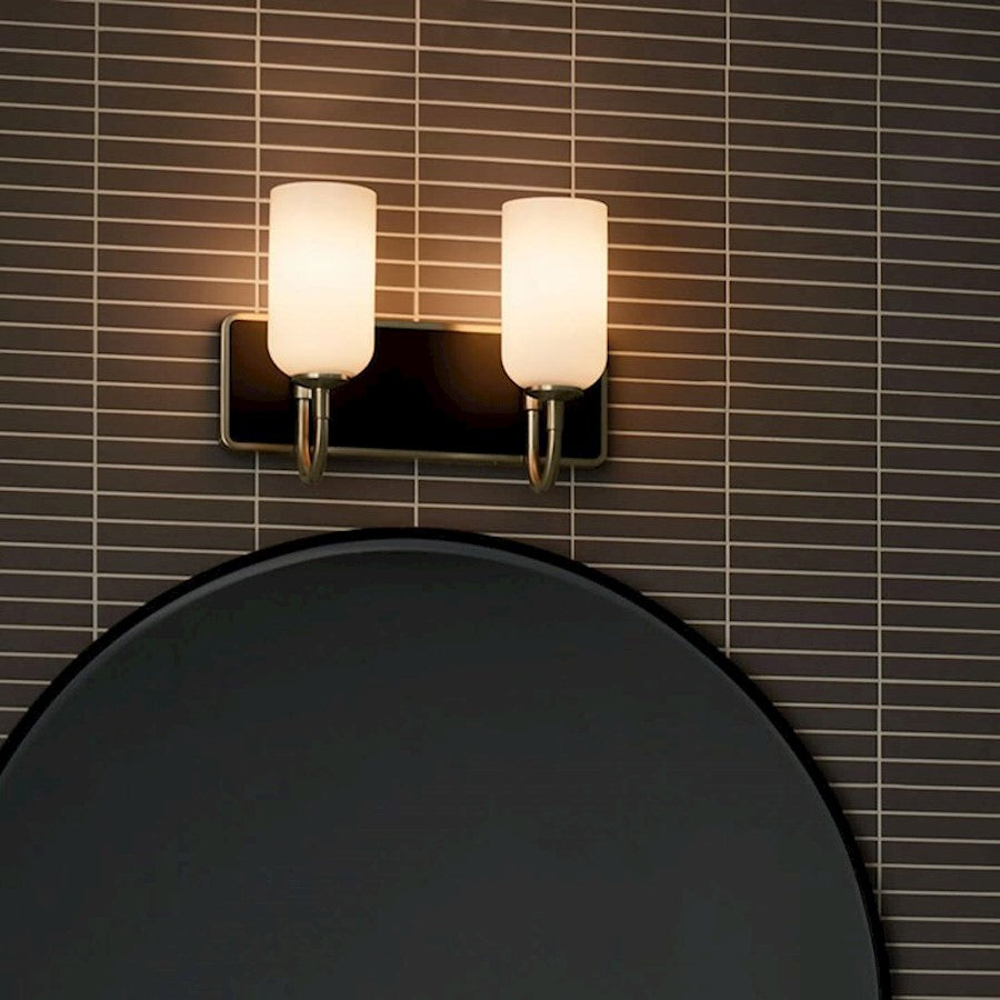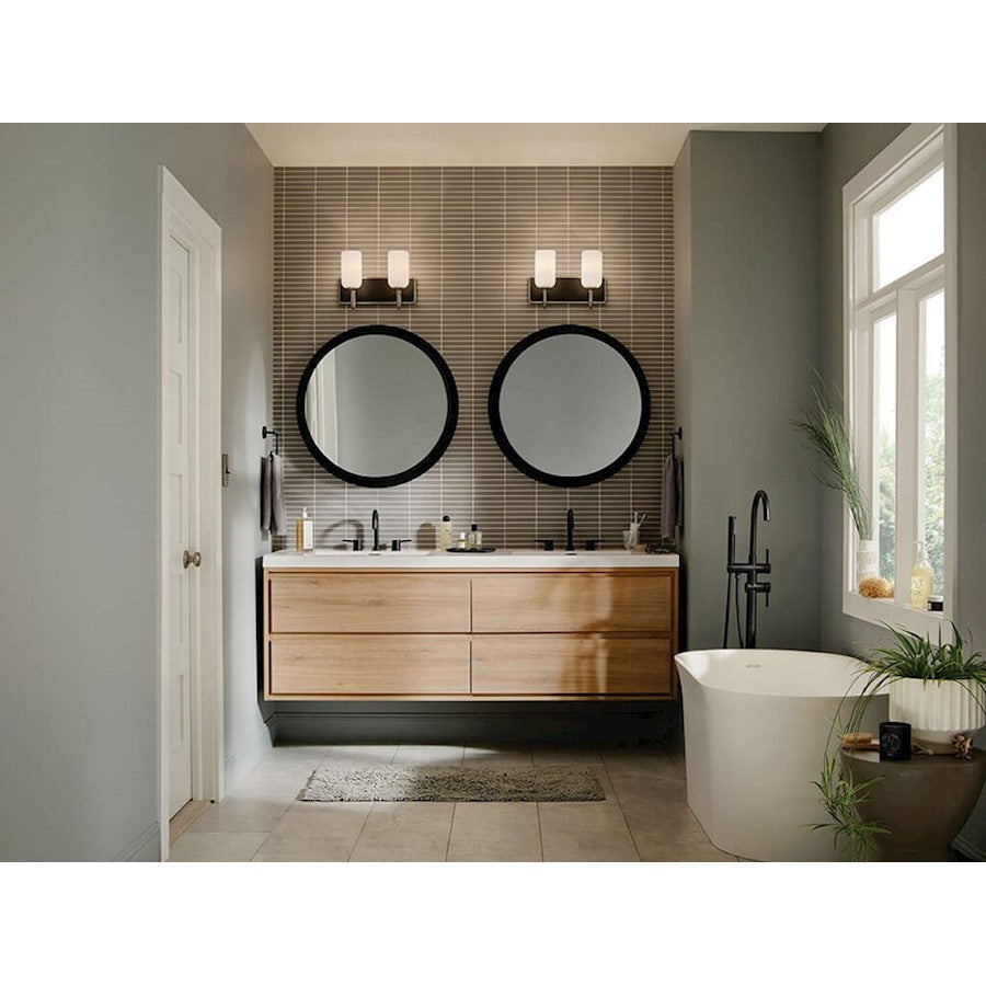 Inspired by simplicity, the Solia 2 light vanity exudes soft modern style. It's dual-finished brushed nickel and black backplate or brushed nickel and black backplate or polished nickel and satin nickel backplate adds visual interest. Solia's refined opal glass illuminates in modern sophistication.Height From Center of Wall Opening: 6.25