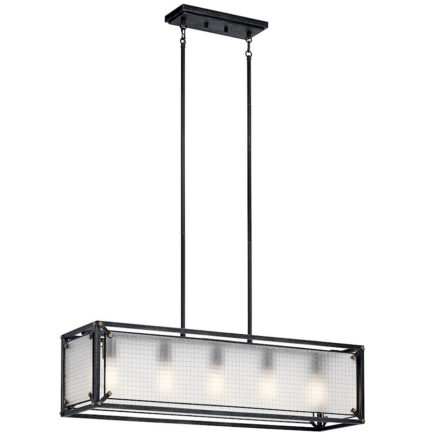 A Distressed Black metal framework holds checkered safety glass of the Steel 5 light linear chandelier in place. Screw-head detailing enhances the industrial look. The glass texture not only adds visual interest; it also helps to softly diffuse the light.