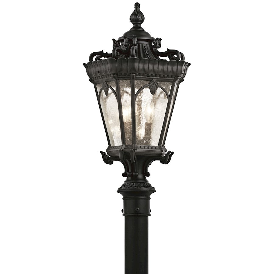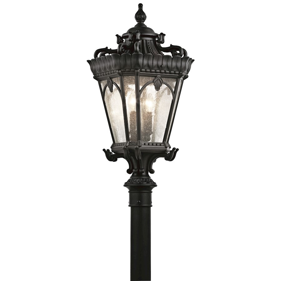 With its heavy textures, dark tones and fine attention to detail, this 3 or 4 light outdoor mounted post from the Tournai collection stands out from other outdoor fixtures. Handmade from cast aluminum, its distinctive Textured Black finish give this piece a unique aged look.