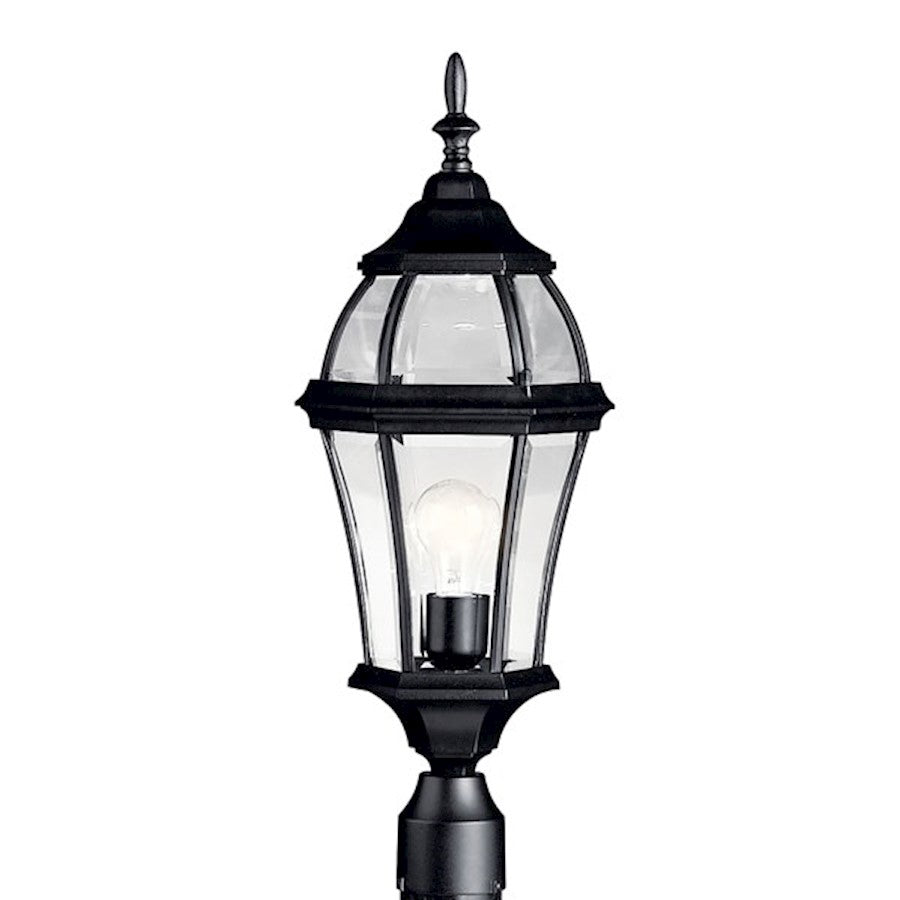 With its tall and intricate design, the Townhouse Collection adds classic form to Kichler's expansive assortment of decorative outdoor lighting. Made by the finest craftsmen in the industry, each piece is formed from cast aluminum and is U.L. listed for wet location, ensuring these high quality fixtures will continue looking fabulous for years to come. The 24 in.. high, 1-light post light is a wonderful piece that features our Black finish or Tannery Bronze with clear beveled glass panels, which uses a 100-watt (max.) bulb that accentuates the luster of your home with zeal. Post Not Included.