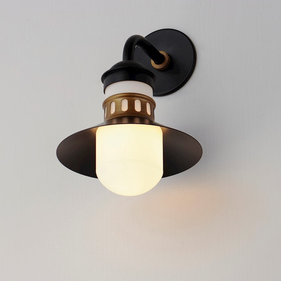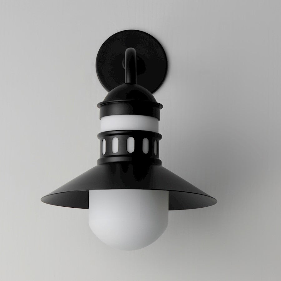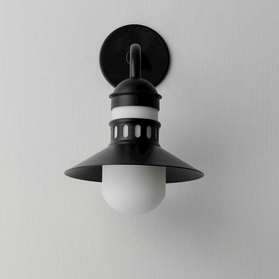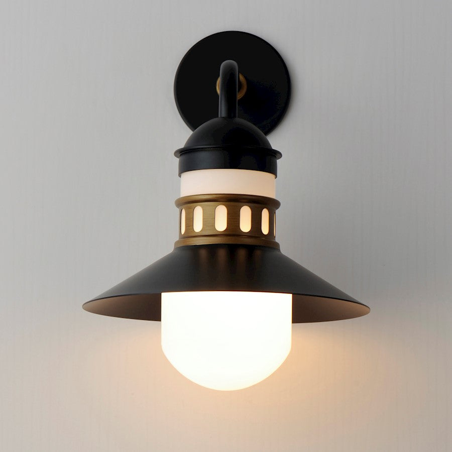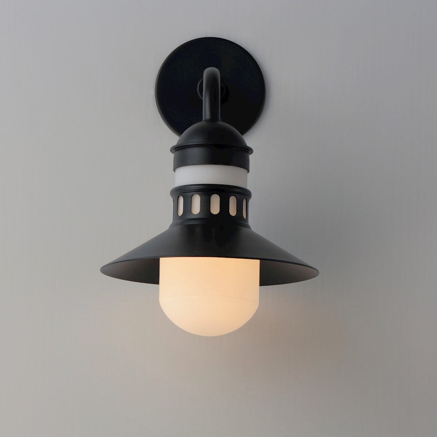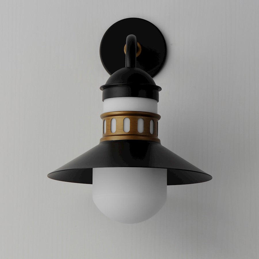Coastally inspired, the wide brimmed aluminum spun shade on this series of outdoor rated sconces, pendants, and flush mounts features a tiered shade design. The ringed separation features a filigree of oval cut outs, whereby a single lamp illuminates the Satin White glass supporting it. The resulting light is dispersed both above and below the spun shade as well as through the patterned filigree. Both modern and classic homes can appreciate this classic design reimagined. The series is available either in Matte Black or a striking Two-Tone Black with Antique Brass.