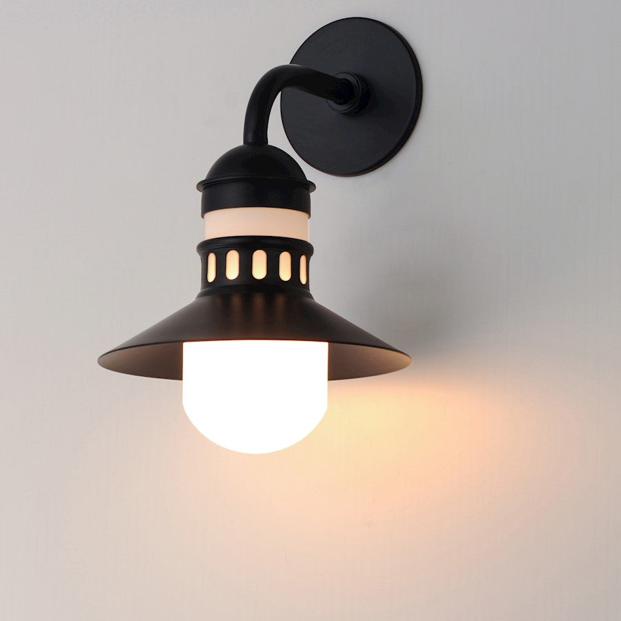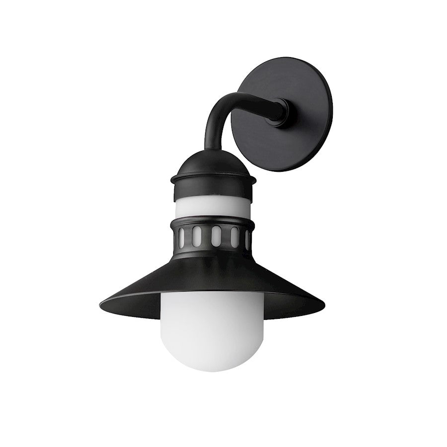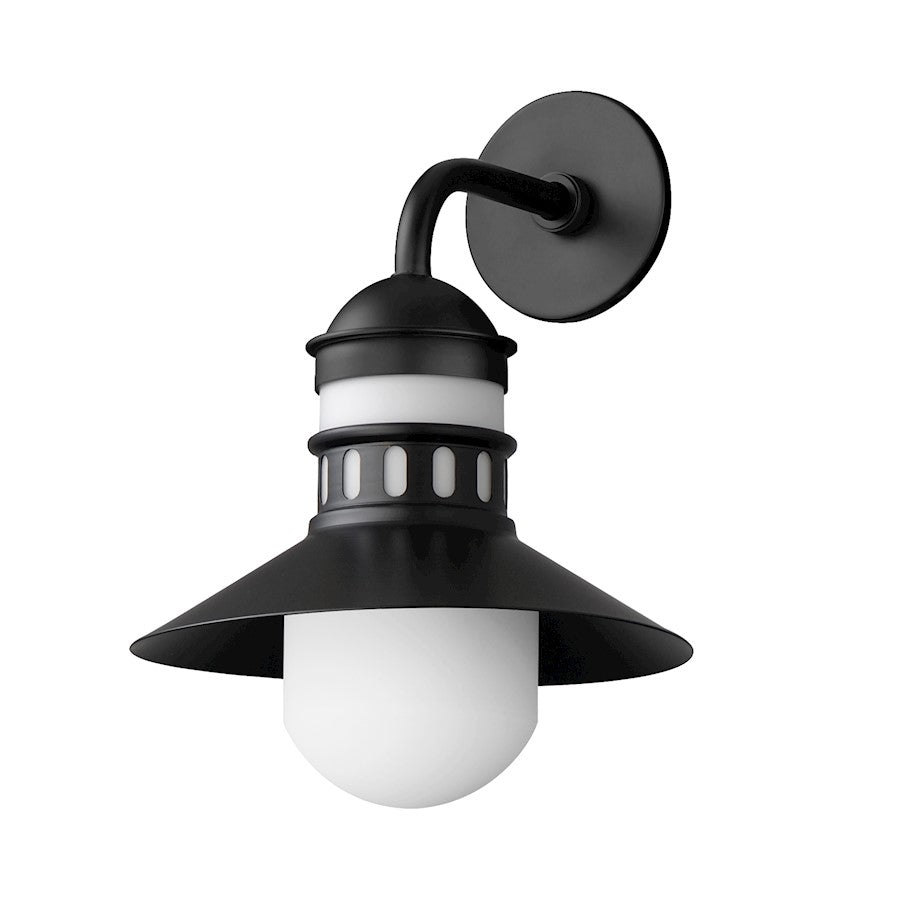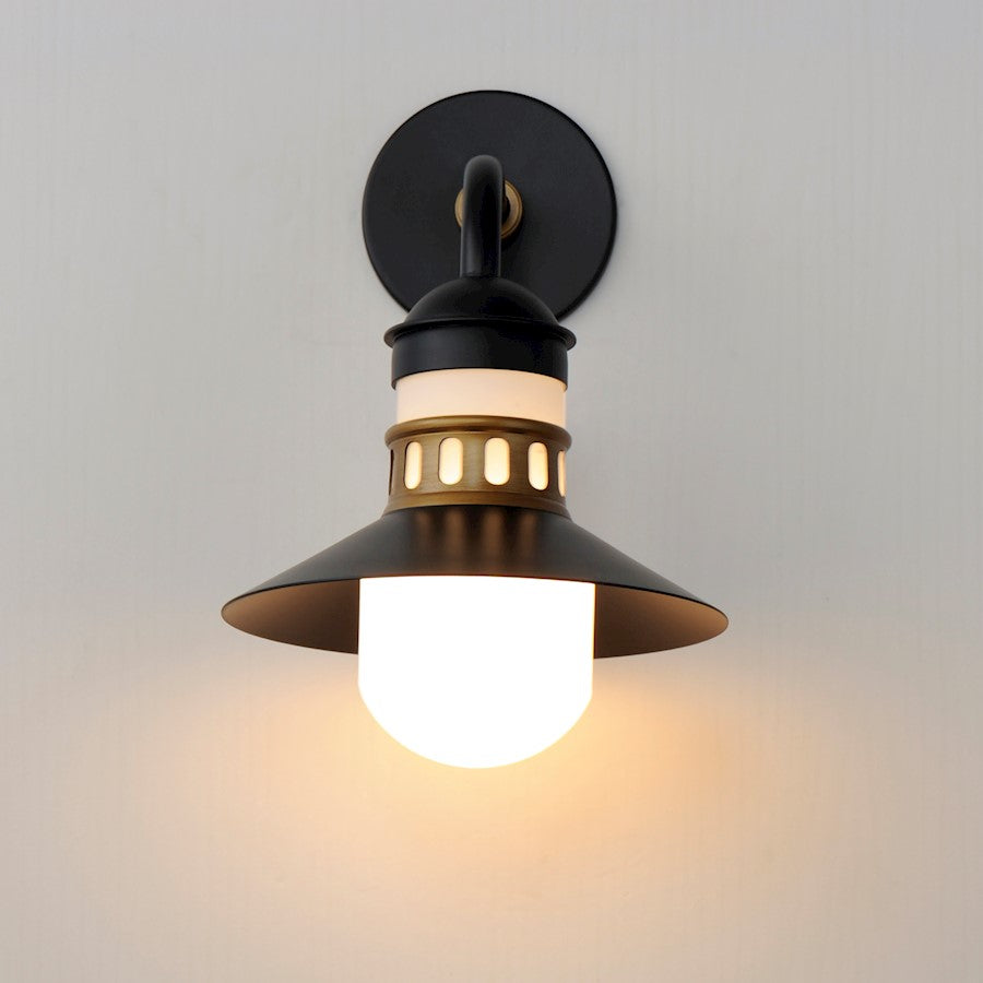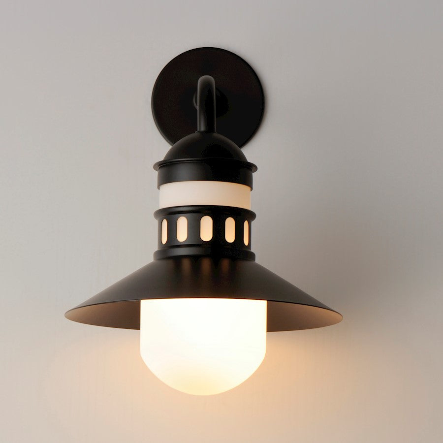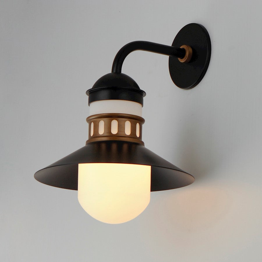 Coastally inspired, the wide brimmed aluminum spun shade on this series of outdoor rated sconces, pendants, and flush mounts features a tiered shade design. The ringed separation features a filigree of oval cut outs, whereby a single lamp illuminates the Satin White glass supporting it. The resulting light is dispersed both above and below the spun shade as well as through the patterned filigree. Both modern and classic homes can appreciate this classic design reimagined. The series is available either in Matte Black or a striking Two-Tone Black with Antique Brass.