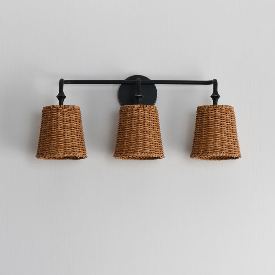 Featuring wicker shades made of synthetic rattan, this bath vanity lighting collection brings an elegant coastal flair to your space. Choose from a Natural wicker finish with a Dark Bronze frame accented by brushed golden highlights, or a Weathered White rattan with a Natural Aged Brass frame for a timelessly elegant composition.
