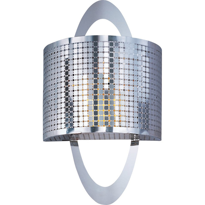 Laser cut halos of metal finished in Polished Nickel intersect the Mirage collection's polished stainless steel shades. Each shade has an etched geometric pattern that casts an interesting pattern of incandescent light that ever changes as you move about the room.