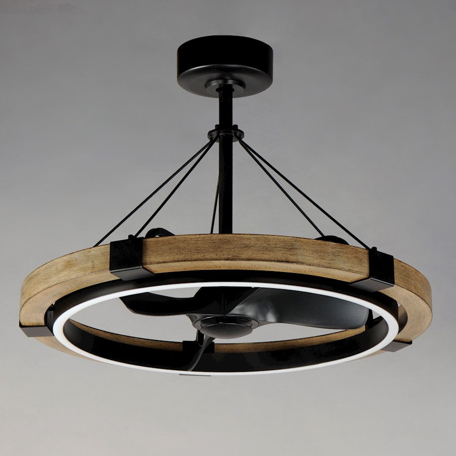 A modern configuration of rustic elements, this Fandelight features a Driftwood finish on ring supported by brackets and thin struts in a contrasting Black steel. Within this timber wheel is an inner Black ring that houses an LED downlight. This minimalist form, with its use of rustic color palette, evokes a strikingly sophisticated composition that complements a wider variety of design aesthetics both rustic and modern. Whether used in a bedroom, entry, or over your dining space, this Fandelight is far more refreshing that conventional ceiling fans and much cooler than a light alone.