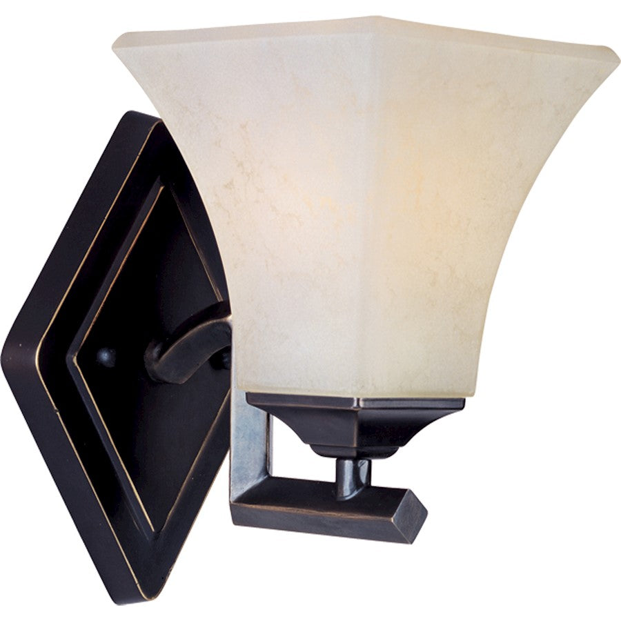 Soft curves meet straight lines in this arts and crafts inspired design. The frame is finished in Heirloom Brass and enhanced by the flowing lines of the Frost Lichen glass.