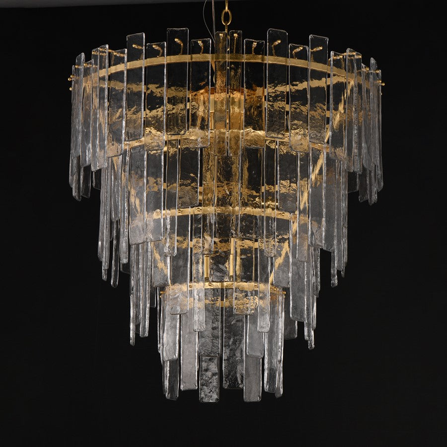 Gracefully flowing molten glass panels with a uniquely organic aesthetic encircle rings of rich Darkened Bronze metal or hand-applied Gold Leaf. This refined interpretation of tiered glass pendants exudes warmth and elegance, effortlessly blending a moody ambiance with timeless contemporary charm.