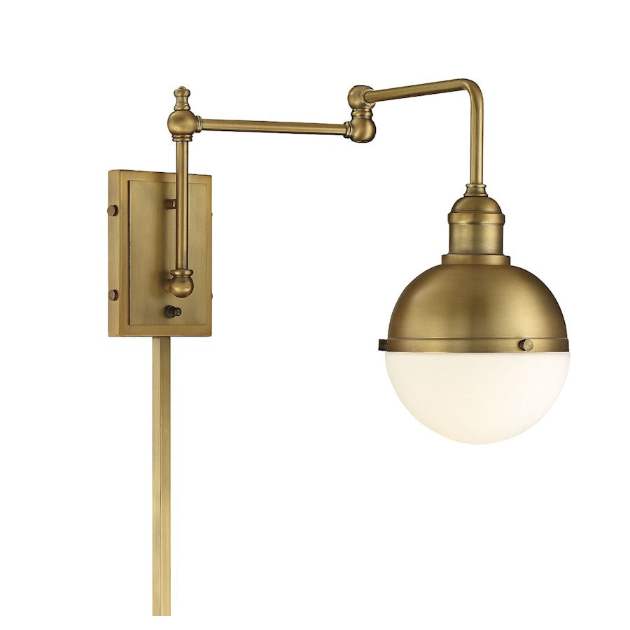 This 1-light wall sconce turns heads with its vintage-inspired design and natural brass finish, but what makes it even better is the convenient adjustable arm that allows it to bring light exactly where it is needed. An on-off switch is mounted on the backplate for ease of use and the sconce can be installed normally or plugged in, making it great for use in areas where it is not possible to hard-wire a new fixture. It is 12" in height and 6.5" in width. It extends 20" from the wall. It uses 1 standard size bulb of up to 60 watts, is LED compatible and is dimmable.