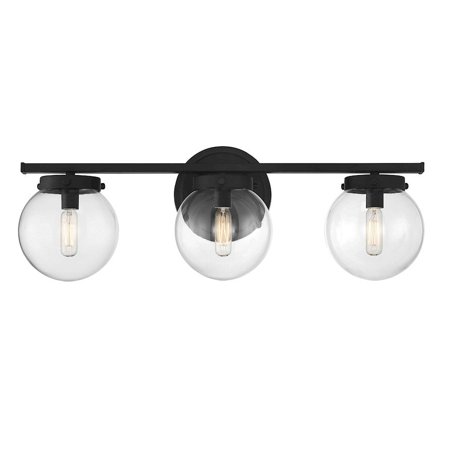 Add a bubbly look to your bath with this Meridian 3-light bath bar! Its streamlined design features globes of clear glass, a shape that is echoed in the circular backplate. This light will really pop in bathrooms with contemporary, modern and midcentury modern styles. Finished in matte black, it is also damp area rated. This bath light is 8" in height and 24" in width. It extends 7.25" from the wall and can be mounted with the shades facing up or down. It uses 3 candelabra size bulbs of up to 60 watts each, is dimmable and is LED compatible.