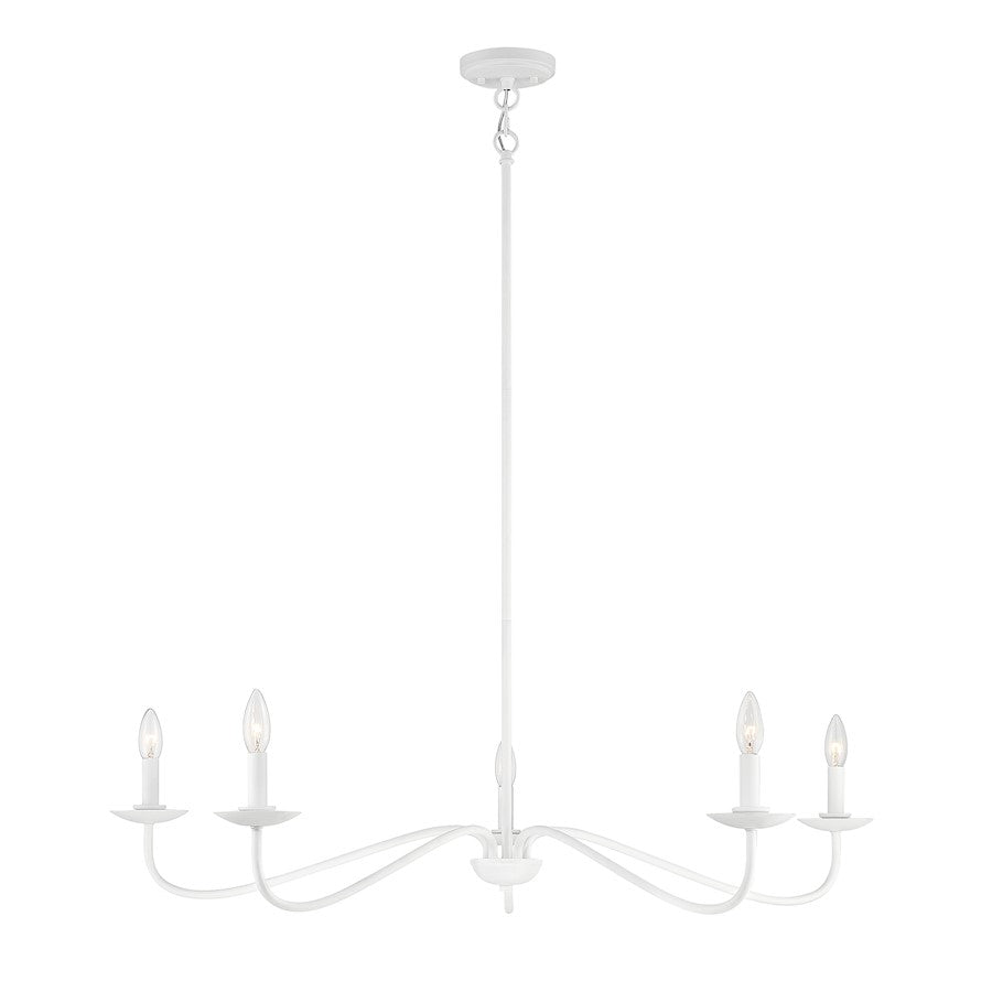 This 5-light chandelier makes a big statement with its long, dramatically curving arms and bisque white finish. Use it to add a fresh new look to rooms with traditional, contemporary and even farmhouse decor styles! 7" height, 42" width. Uses candelabra size bulbs, max 60 watts per bulb. LED bulb compatible.