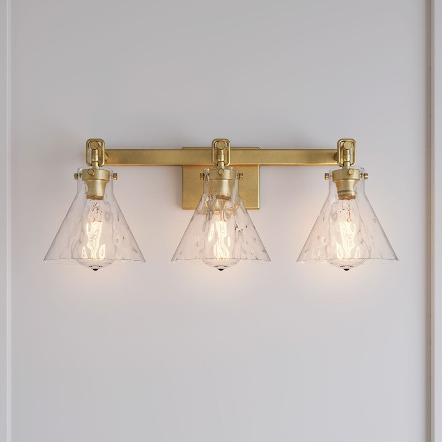 The Barlon Collection of vanity and pendant lighting provides a unique touch of style with artfully flared, clear water glass shades. The fixtures are a modern take on classic hook-style lantern lighting and are available in matte black, polished nickel, vintage brass, or modern gold with 1-light, 2-light, and 3-light options. This collection is the perfect look for a modern farmhouse or industrial-style loft.