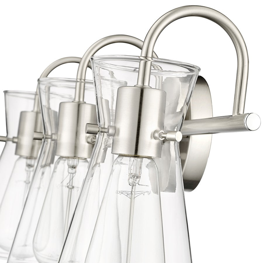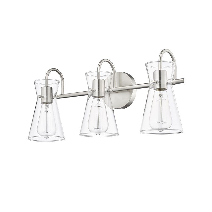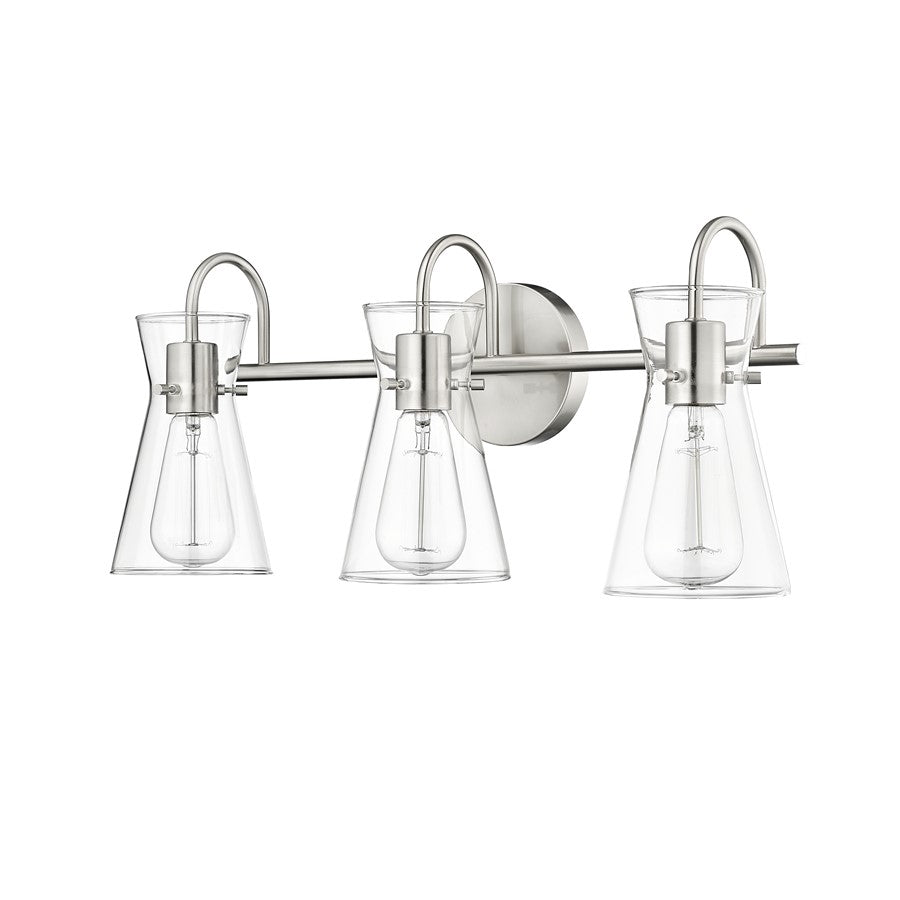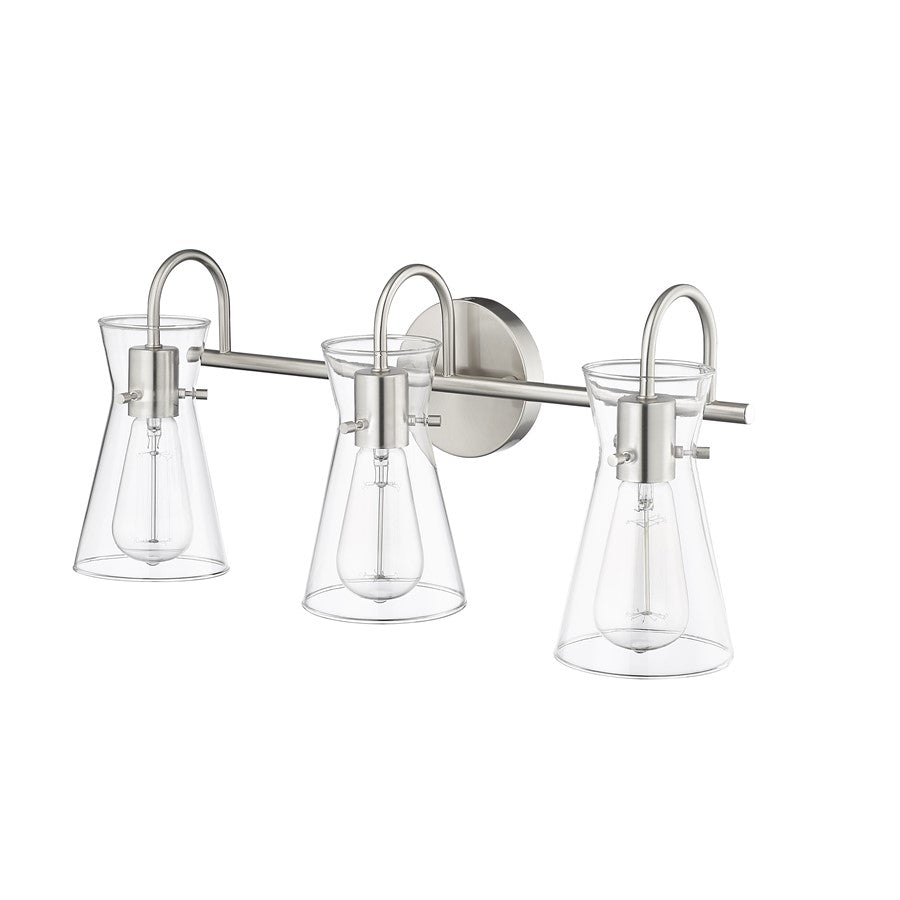 Distinctive beaker-shaped clear glass globes define the look of the Camellia Collection of vanity lighting. The overall design ensures well-defined lighting without shadows in the most needed spaces. The fixtures, featuring swan-neck lines and finished in modern gold, brushed nickel, or matte black, complete the overall design-forward effect and are available in 2-light, 3-light, and 4-light options.