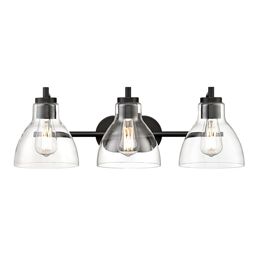 Refined simplicity is the hallmark of the Knightsdale Family of vanity lighting. Graceful bell-shaped clear glass shades set an elegant tone and provide a crisp clear lighting effect perfect for any bath. The minimalistic hardware strikes the perfect balance with the shades and is finished in matte black, chrome, or modern gold. Available as 1, 2 and 3-light options, these fixtures create a sleek and understated profile.