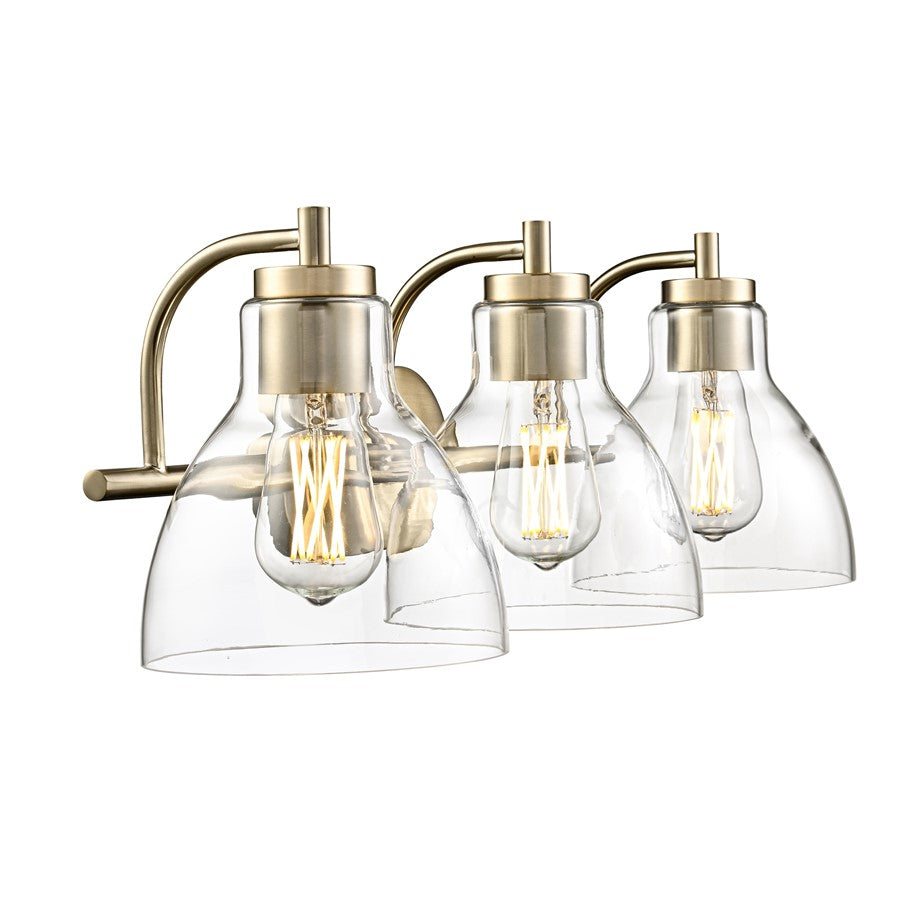 Refined simplicity is the hallmark of the Knightsdale Family of vanity lighting. Graceful bell-shaped clear glass shades set an elegant tone and provide a crisp clear lighting effect perfect for any bath. The minimalistic hardware strikes the perfect balance with the shades and is finished in matte black, chrome, or modern gold. Available as 1, 2 and 3-light options, these fixtures create a sleek and understated profile.