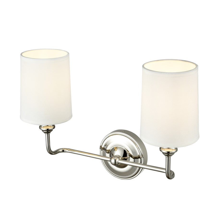 The Leena Family of sconce lighting is reminiscent of vintage candleholders influenced by Early American design. Finished in matte black, polished nickel, or vintage brass, the sconces are available as 1-, 2-, and 3-light options. These classic fixtures are finished with white fabric shades for a warm glow and are perfect for hallway, bath, or bedroom.