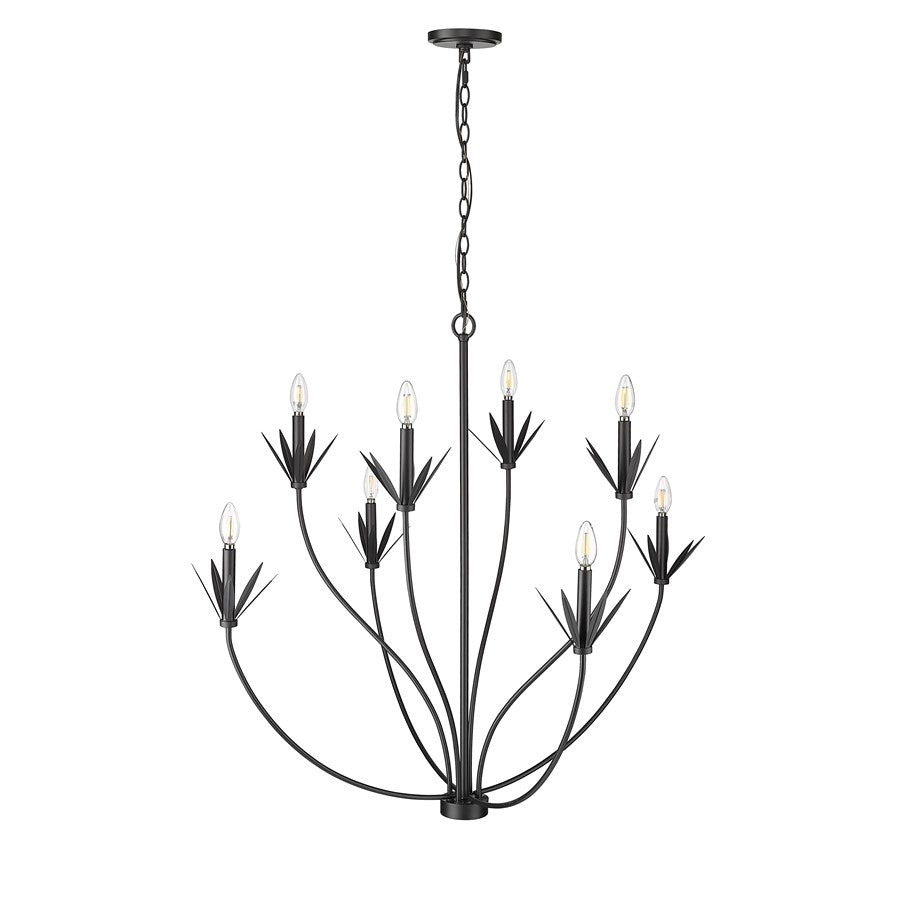 The Primrose Collection is defined by chic, linear leaf-shaped flourishes punctuating the fount and candle cups of these chandeliers. The sweeping, gentle curves and modern take on a botanic profile create a joyous effect for any gathering room from farmhouse to penthouse. The fixtures are available in either matte black or textured white with 6-light and 8-light options.