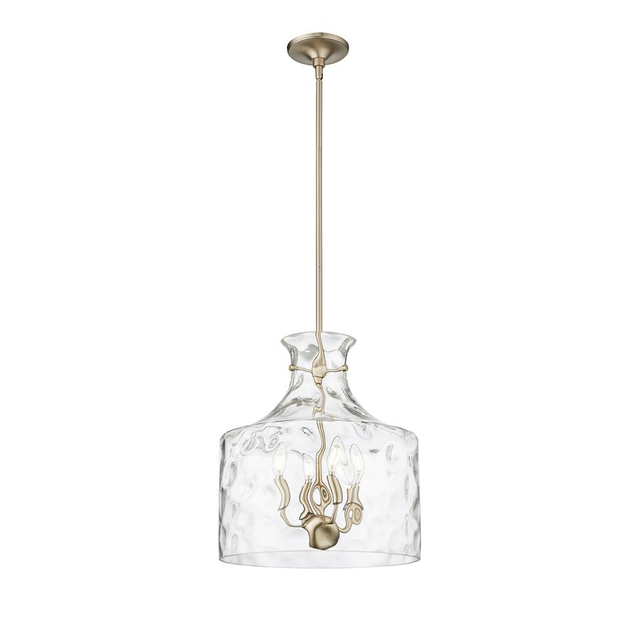 The Santorini Family of pendant lighting is distinguished by delicately suspended, handblown-style water glass shades, creating a playful dappled lighting effect. Available as 1- and 4-light options, the fixtures are finished in matte black, modern gold, or polished nickel. A unique design statement, these pendants complement any design scheme from ultra-modern to midcentury.