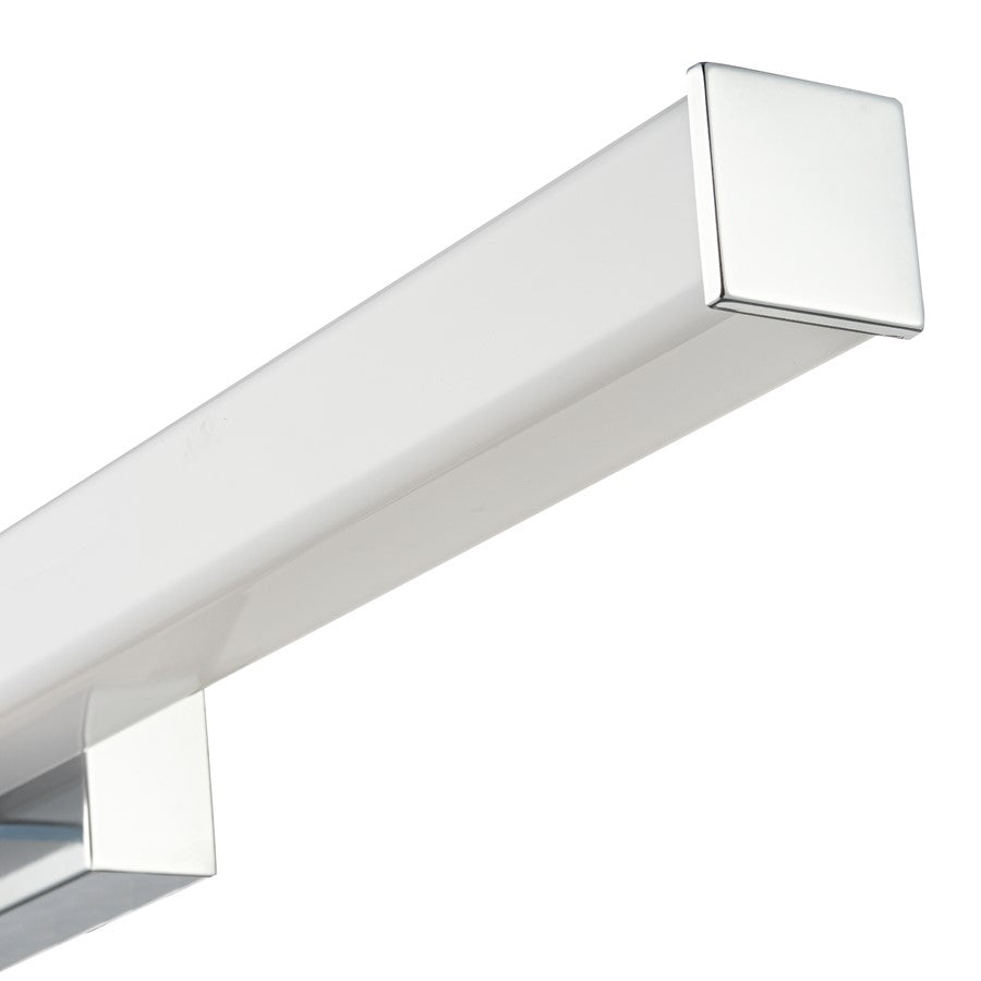 - This fixture features a chrome finish and white acrylic shade.