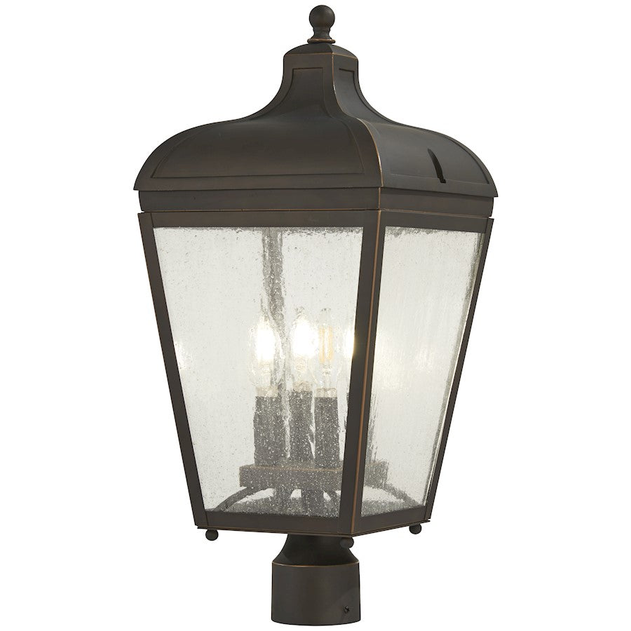 The Marquee Collection by The Great Outdoors features a tapered clear seedy glass shade framed in Oil Rubbed Bronze finished aluminum. Atop the body is a decorative, with a loop at the end for aesthetic effect. The light itself is warm, partially diffused, with a noticeable shimmer as it plays off the imperfections in the glass.