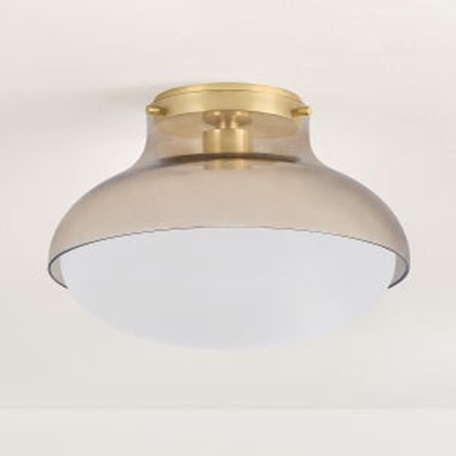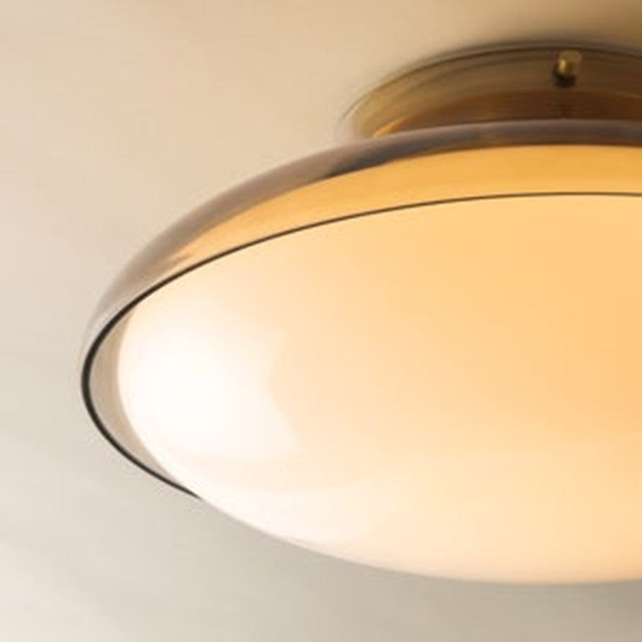 The soft curves and mechanical detailing of Gianna create visual tension while retaining a sense of balance. A light bronze glass layer melts from an Aged Brass canopy, surrounding a glossy opal glass inner shade to form the organic design. The clean, minimalist shape is elevated by the distinctive double glass composition and the industrial-style pins that hold the entire fixture together.