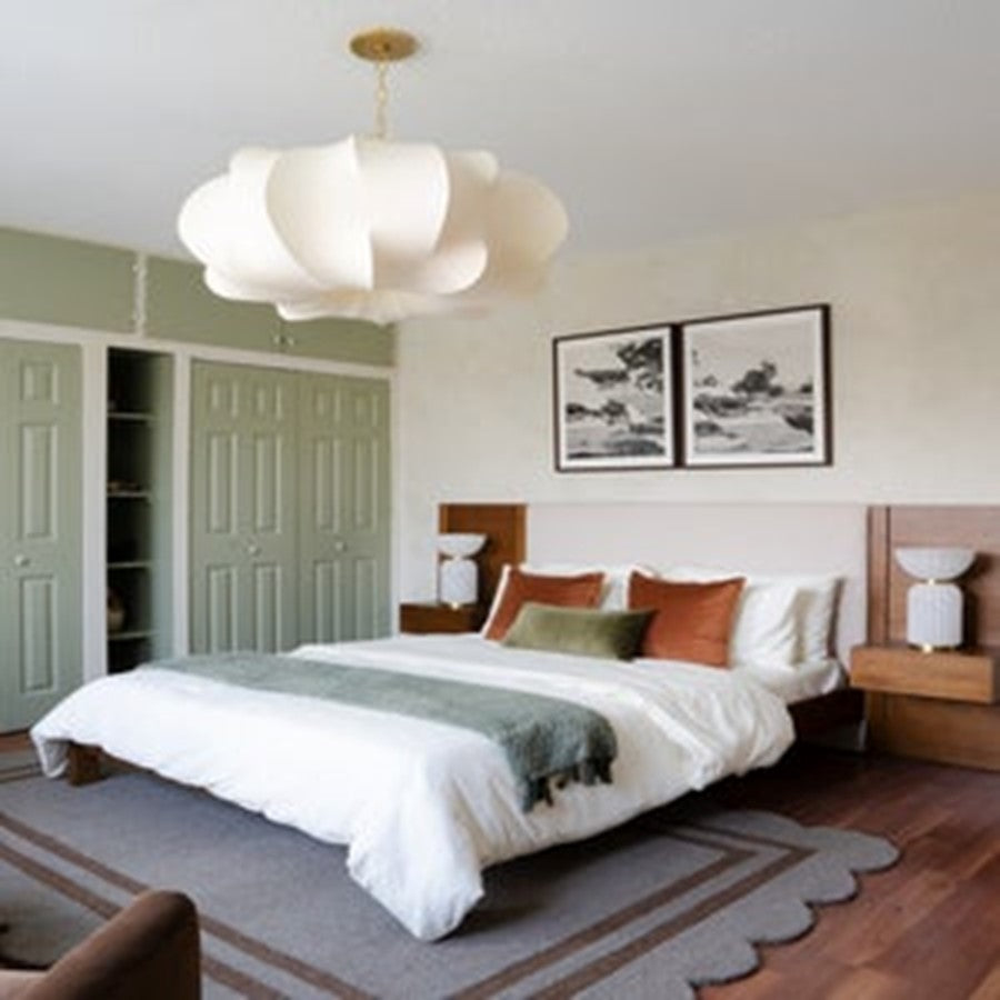 Light and voluminous, the Keilah pendant floats above a space like a cloud. The polymer shade features staggered ribs that give it a playful and unexpected structure. An Aged Brass-finished chain supports the shade, adding a note of shine. This overscale, mood-boosting pendant is available in two sizes.