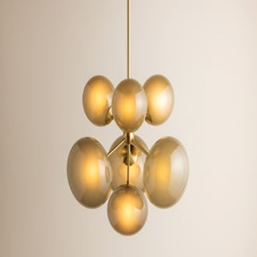 A mid-century modern Sputnik silhouette gets an artful update in the Zaley pendant. Slightly irregular light bronze glass globes radiate from a central sphere finished in Aged Brass. The moody mix of form and tone creates an electric conversation starter. Available with 4 or 7 lights.
