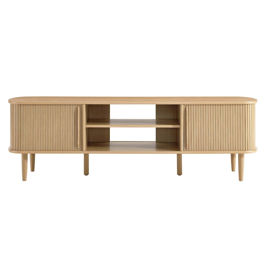 Invite mid-century aesthetics into your living space with the Contour 63" TV Stand, a standout addition for those seeking stylish TV stands for the living room. The Contour TV stand features retro beadboard and an organic silhouette that stands on four tapered legs with two middle support legs, rendering it a modern TV console that blends seamlessly with various interior styles. Crafted with rubberwood, MDF, and particleboard, this TV stand is complete with a center storage area featuring an adjustable shelf and open back, perfect for organizing your media entertainment needs. This TV stand includes two side storage areas with sliding doors to organize and conceal your items. Accommodating TVs up to 70", the Contour is the perfect modern addition to the living room, lounge area, or recreation room. Includes adjustable, non-marking foot pads for extra stability and floor protection. Assembly required. Weight Capacity: 200 lbsSet Includes: One - TV stand
