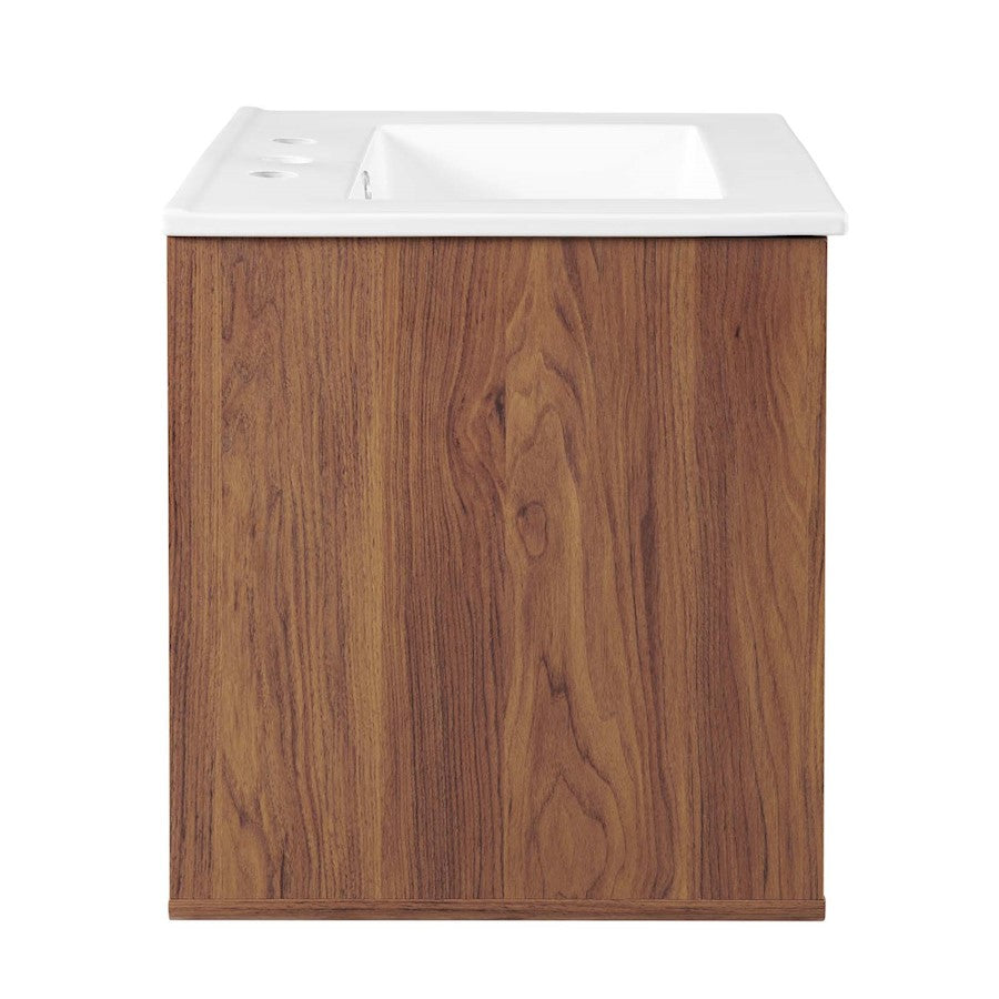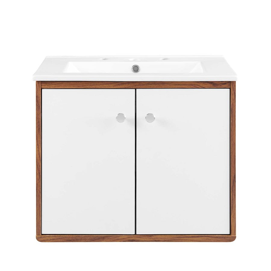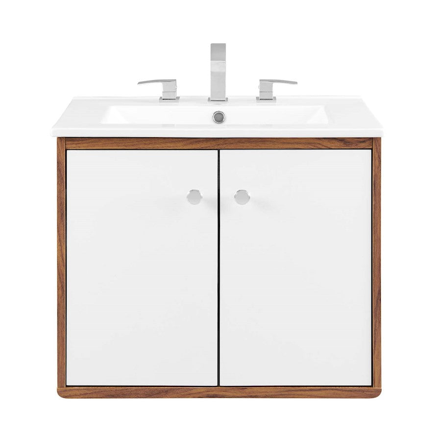 Bring mid-century modern aesthetics into the bathroom with the Transmit 24" Bathroom Vanity. This vanity features a durable particleboard and walnut grain veneer construction with ample storage space for all your bathroom essentials behind two white lacquered soft-close hinged doors. A ceramic sink with an integrated countertop, 8" centerset, and rectangular sink basin continue the sleek look of this retro modern vanity. Complete with chrome knobs, this bathroom vanity mounts directly to the wall saving a substantial amount of floor space. Assembly required and sink fixtures not included. Set Includes: One - Transmit 24" Wall-Mount Bathroom Vanity