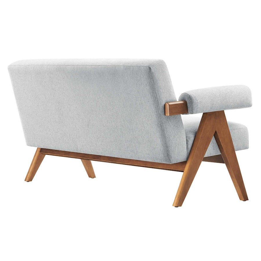 Add comfort and style to your home with the Lyra Heathered Fabric Upholstered Loveseat. This contemporary settee is chic and luxurious, featuring a relaxed design with a subtly angled backrest. Lyra comes upholstered in woven heathered fabric, creating a comfortable resting spot where you can dive into a good book or enjoy a cup of coffee. Featuring a sturdy plywood frame, inverted V-shaped rubberwood legs, and dense foam padding, this modern loveseat provides stability while enhancing living room, bedroom, hallway, or entryway spaces. Includes non-marking feet. Assembly Required. Weight Capacity: 662 lbs. Set Includes: One - Loveseat