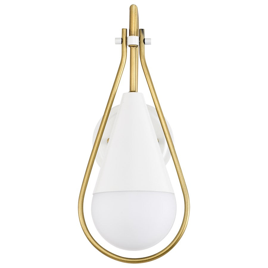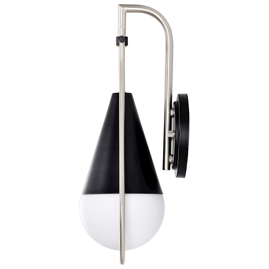 A modern collection with a twist, the Admiral one light wall sconce features a dual finish, unique design, and a fashionable statement for home luminaires. A suspended tear-dropped shape is comprised of matte black/brass or matte black/brushed nickel or matte white/brass elements encompassing the fixture. The white opal glass orb shields the light source for smooth, even lighting to bring a warm glow to any space. A beautiful design that is versatile and will compliment a variety of home decors.