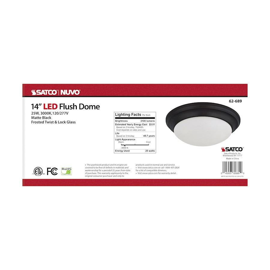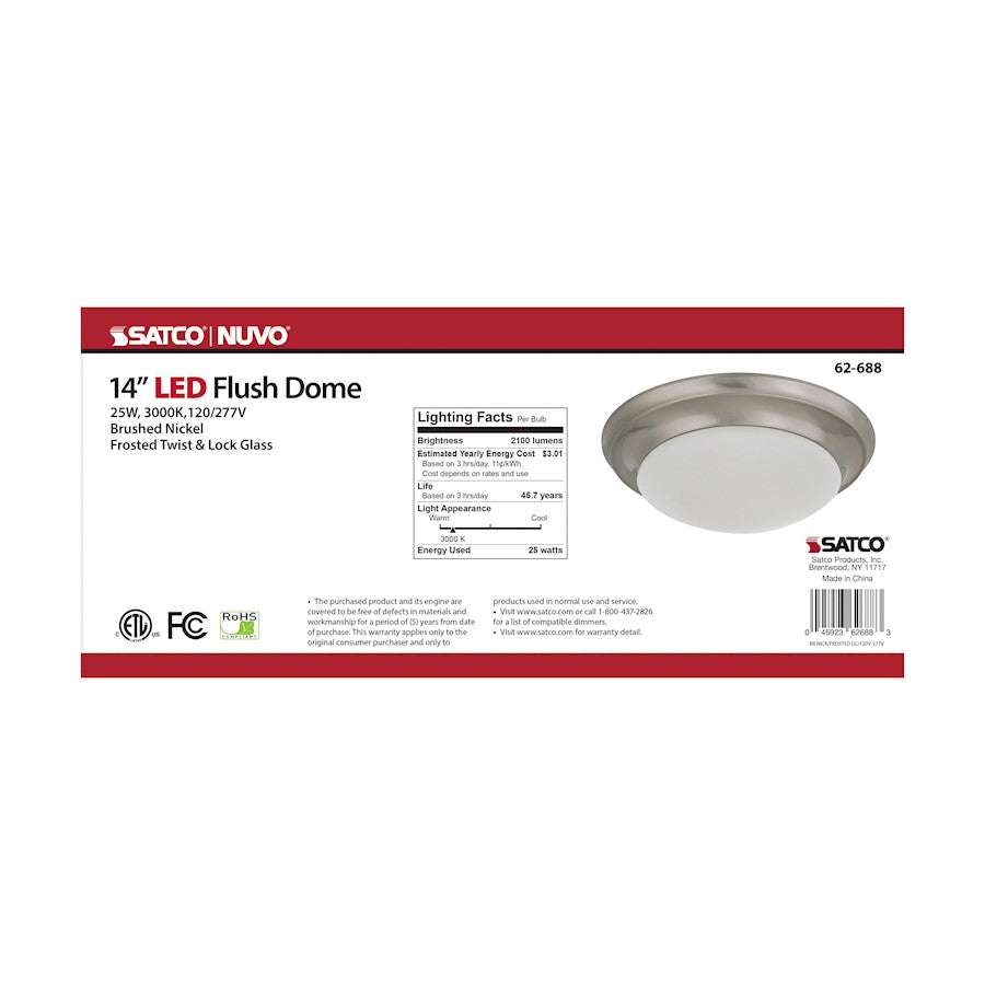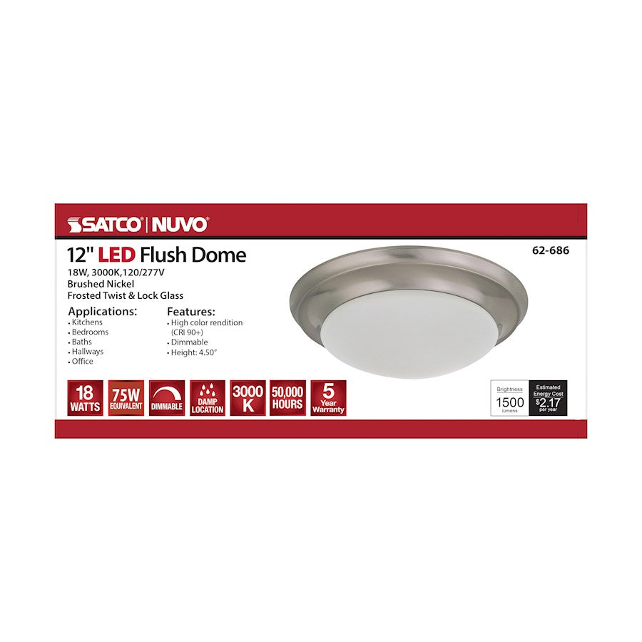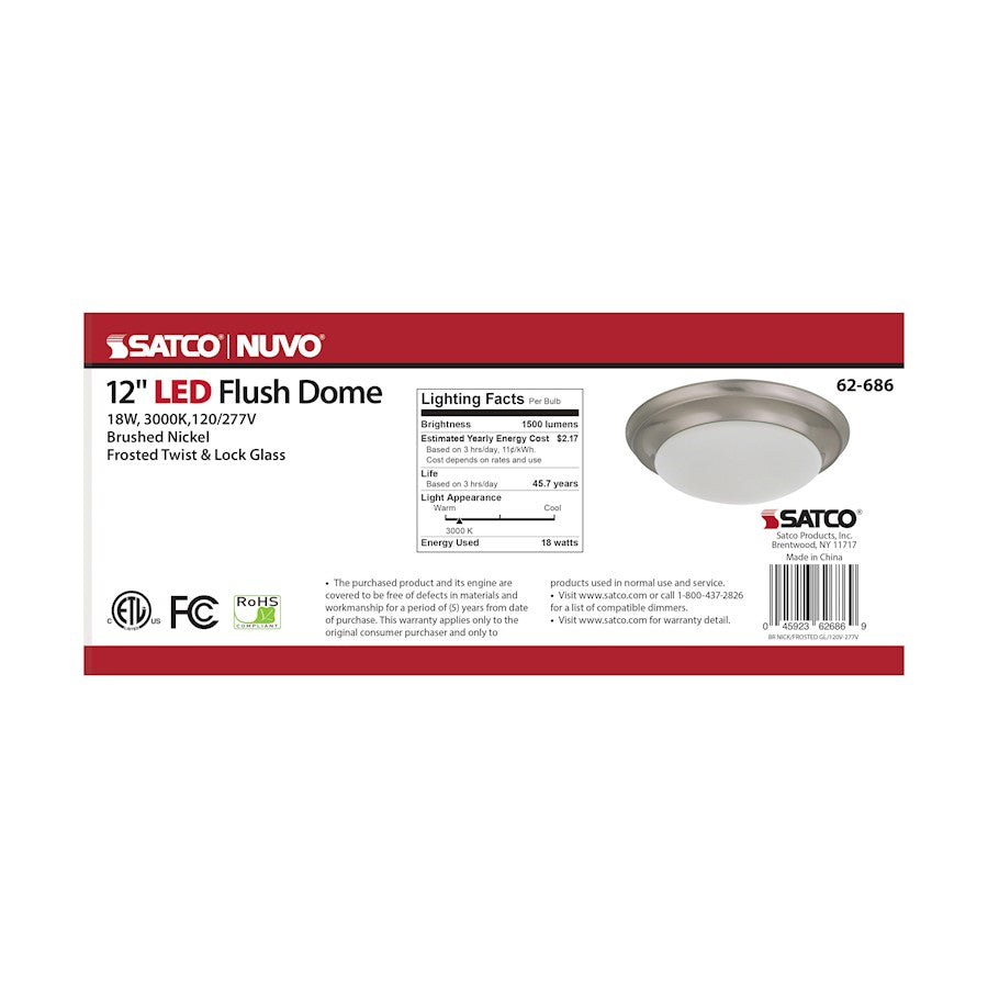 Nuvo's 18 or 25-watt, 12 or 14 inch flush mount twist and lock fixture features a matte black or brushed nickel finish with frosted glass. Damp rated, this fixture is ideal for illuminating kitchens, hallways, bedrooms, and stairwells in residential and multi-family environments. Energy efficient with integrated LED technology, this flush mount fixture delivers 50,000 hours of exceptional illumination.